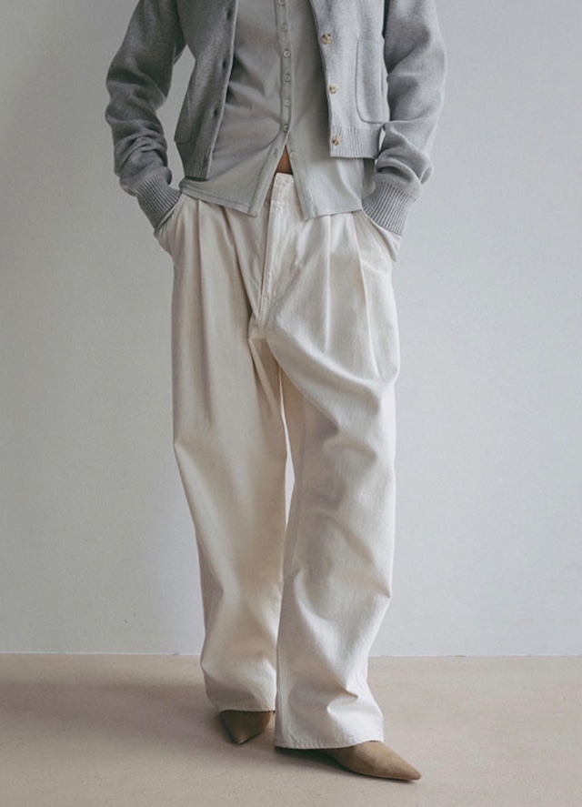 【商品紹介】 ライトオンスならではの軽やかな穿き心地と、タックが生み出す立体的なシルエットが魅力のデニムワイドパンツ。 綿100のデニム素材を使用、デニム特有のカジュアルさを残しながらも、軽さとやわらかさを兼ね備えた風合いに仕上げています。 ほどよくラフな表情がありながら、春の装いに取り入れやすい軽快さがあり、長時間の着用でもストレスを感じにくい快適な穿き心地を実現。 ハイウエスト設定でスタイルアップを叶えつつ、ウエストはベルトレス仕様にすることでミニマルな印象に。 デニムでありながらフロントにタックを取り入れることで、立体感のあるワイドシルエットを表現しています。 内側にはサイズ調整が可能な紐を配しているため、リラクシングなフィット感で着用できるのもポイント。 腰まわりはすっきりと見せながら、脚のラインを拾わないゆとりのあるフォルムで、抜け感のあるバランスに仕上げました。 コンパクトなトップスやフィット感のあるカットソーと合わせてウエストまわりのデザインを活かした着こなしはもちろん、 オーバーサイズのニットやスウェットをラフに合わせてもサマになる一着。 シャツやカーディガンを合わせたきれいめカジュアルなスタイリングにも馴染み、季節を問わず幅広いコーディネートで活躍します。 【カラー】 オフホワイト 【サイズ】 S ウエスト71cm ヒップ119.5cm 股上31.5cm 股下64.7cm わたり周り78cm 裾周り32cm 【素材】 綿100% 【品番】 1226122056 【洗濯表示】 液温は40℃を限度とし、手洗いによる洗濯処理が可能です 漂白処理はできません タンブル乾燥は出来ません 日陰のつり干しがよい 底面温度120℃を限度とし、アイロン仕上げができます 石油系溶剤又はデカメチルシクロペンタシロキサンによる弱いドライクリーニング処理ができます 非常に弱い操作のウエットクリーニングができます ※実店舗でも販売しているため、タイミングによっては売り切れてしまっている場合もございます。 その際はすぐにキャンセル対応させていただきますのでご了承ください。 ※お客様都合でのキャンセル、ご返品・ご交換は承りかねます。何卒ご了承ください。 ※外での撮影画像、お客様のお使いのモニター設定などにより、色味が違って見える場合があります。 商品の色味は、スタジオ撮影の画像をご参照ください。