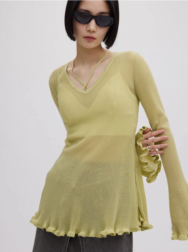袖口と裾に施した程よいフリルは、編み続きで表現。
