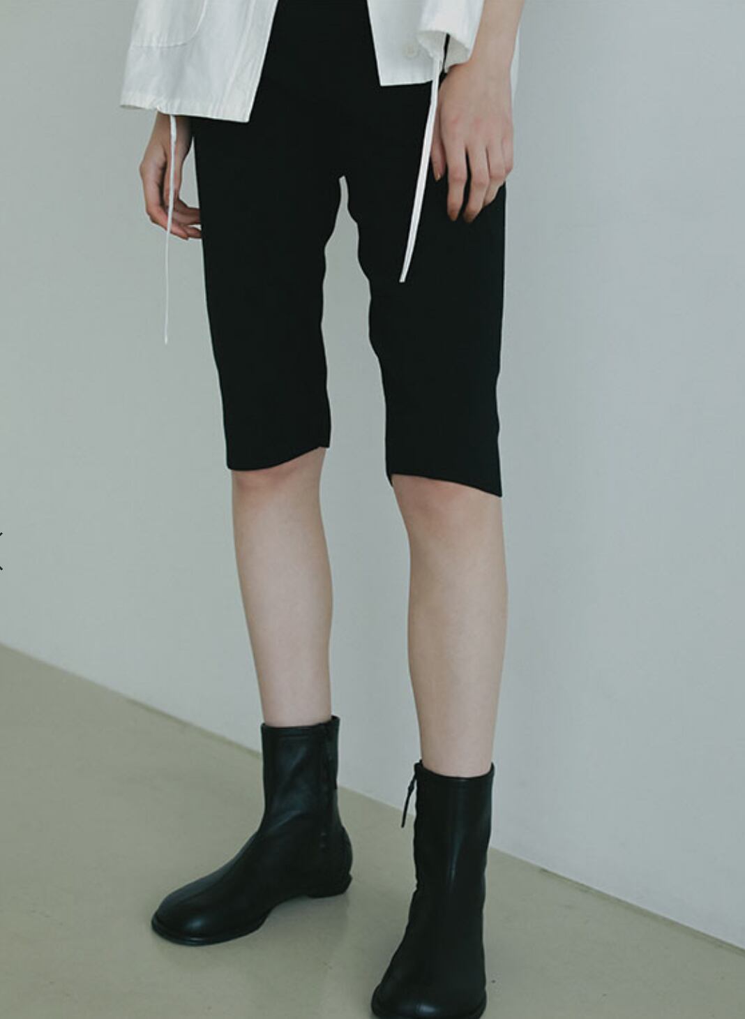 レイヤードにも重宝するバイカーパンツは長めのトップスと合わせるだけで洗練されたバランスに。