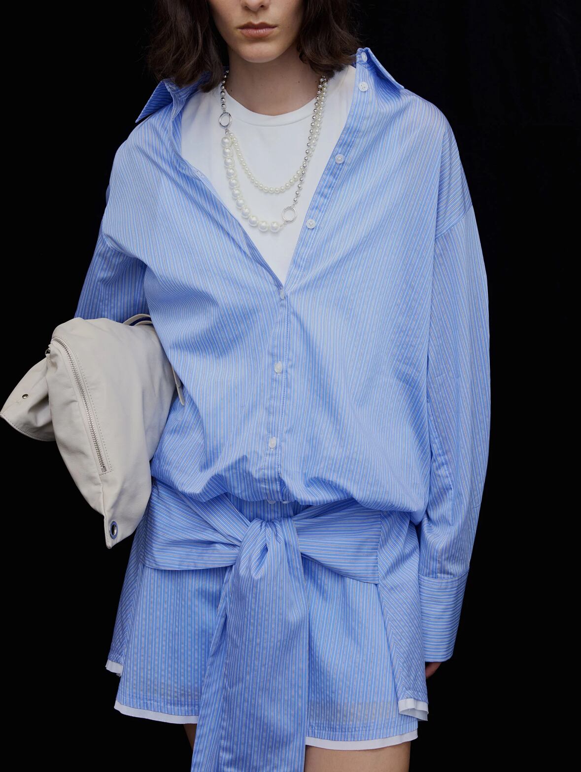 柔らかいシンセティックレザーを使用した巾着型バッグ。
