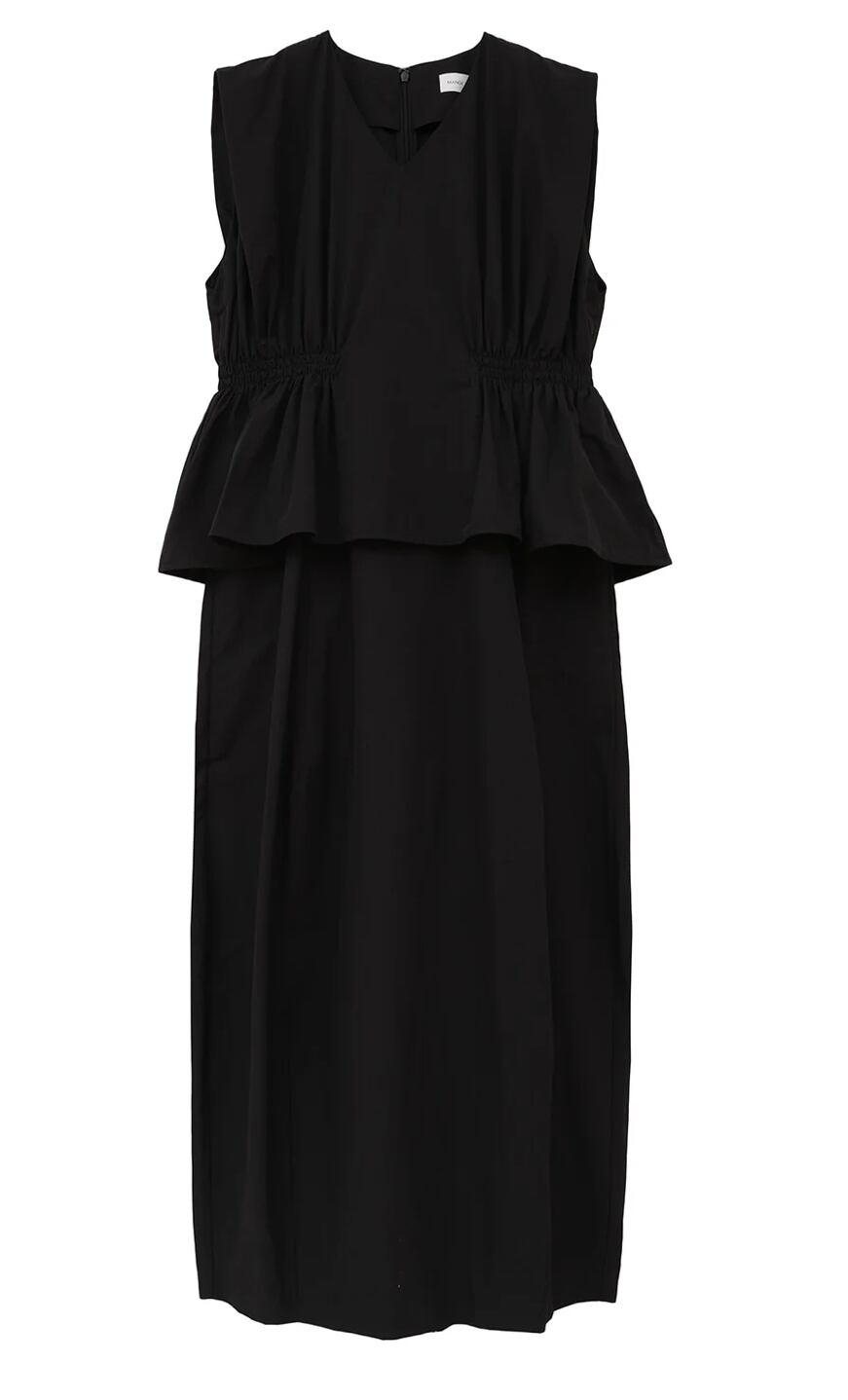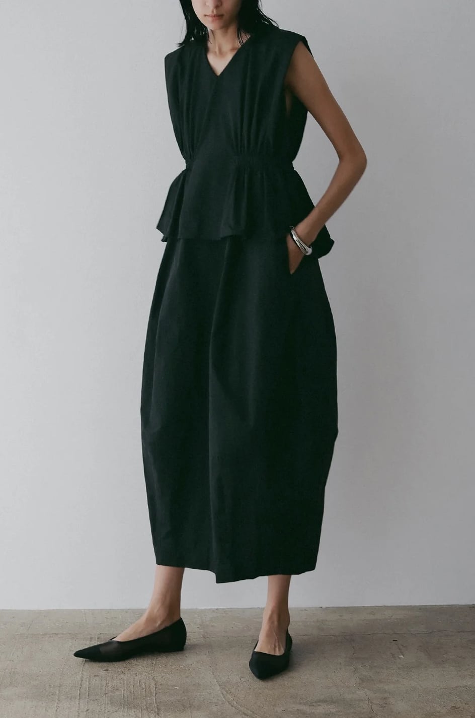 ウエストにギャザーを入れたペプラムシルエットのトップスとコクーンシルエットのスカートをドッキングさせたワンピース。