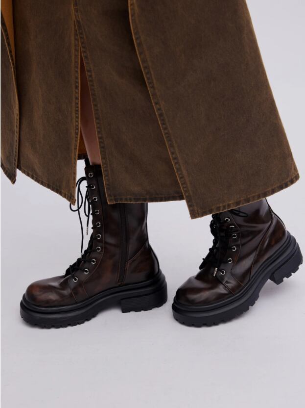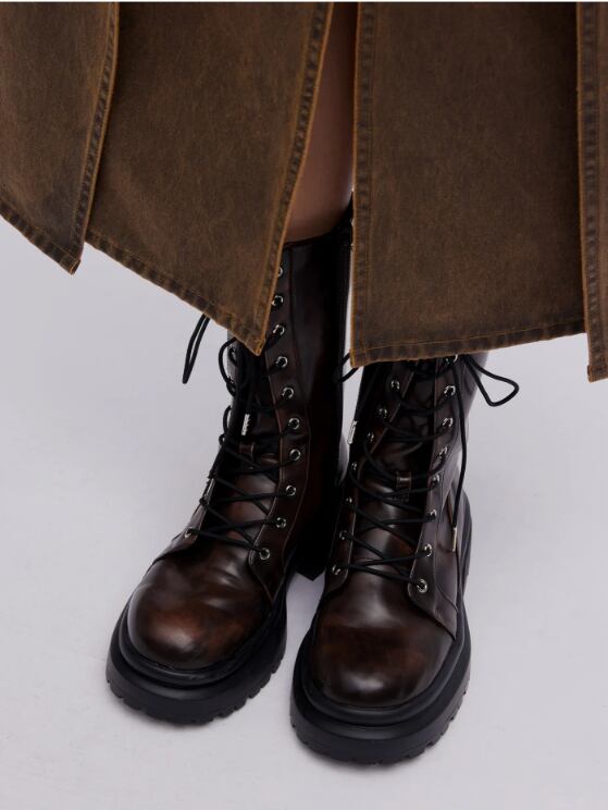 甘めのレースアップデザインに、メンズライクなボリュームのあるソールを合わせたアイテム。