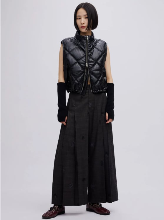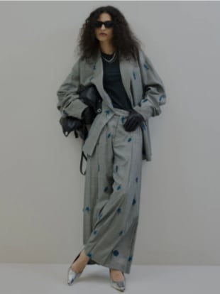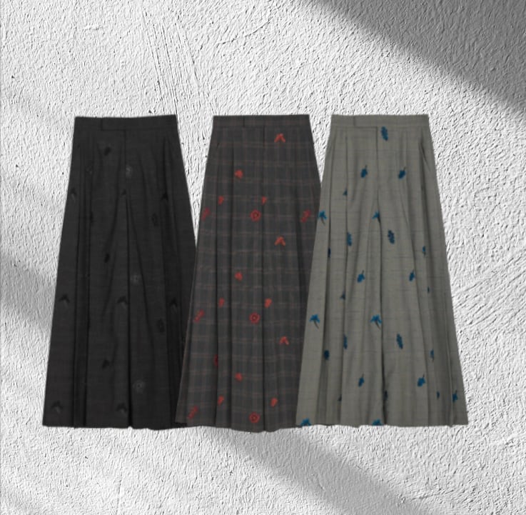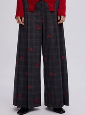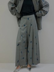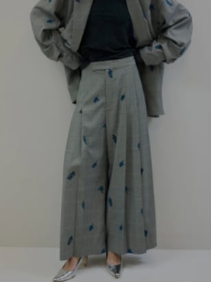 チェック生地に全面花柄モチーフの刺繡を施したプリーツパンツ!