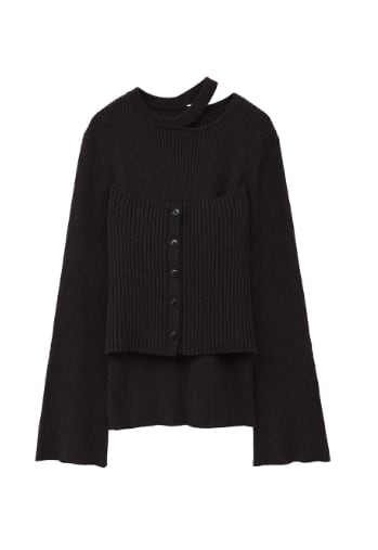 ボタンでアレンジ可能なビスチェはあえてボタンを掛け違えてアレンジしたり、