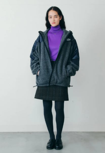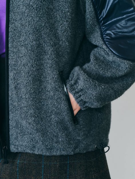 表糸にウールナイロンの混紡糸、裏糸にポリエステルを用いた生地で作ったハリ感とボリューム感を感じさせるフーディーブルゾンです。