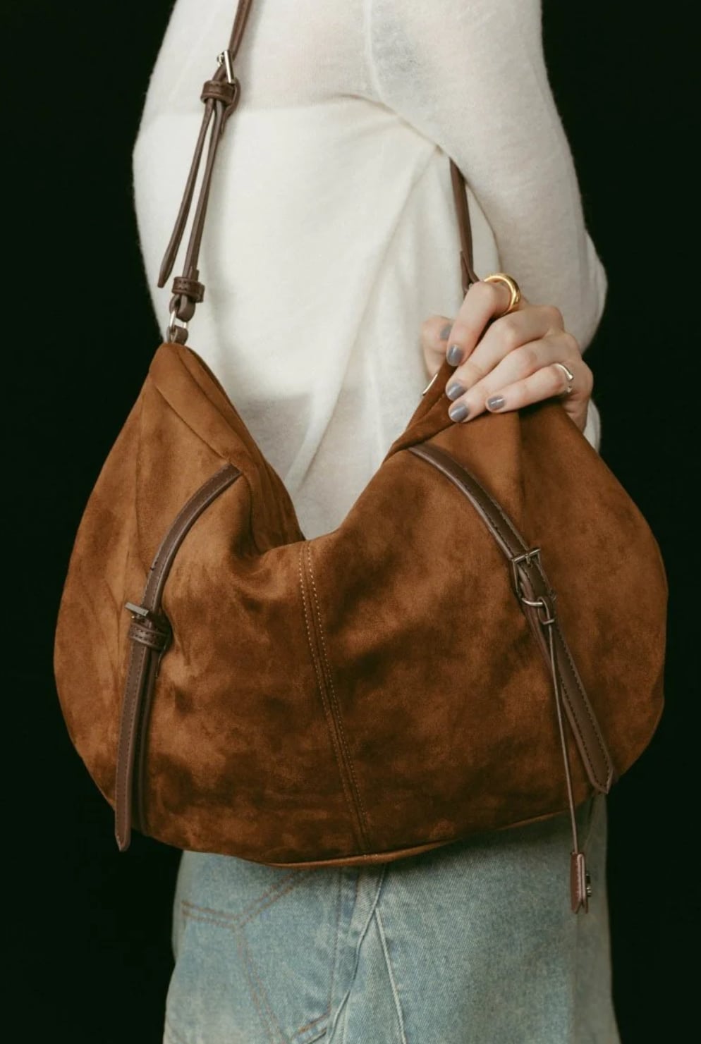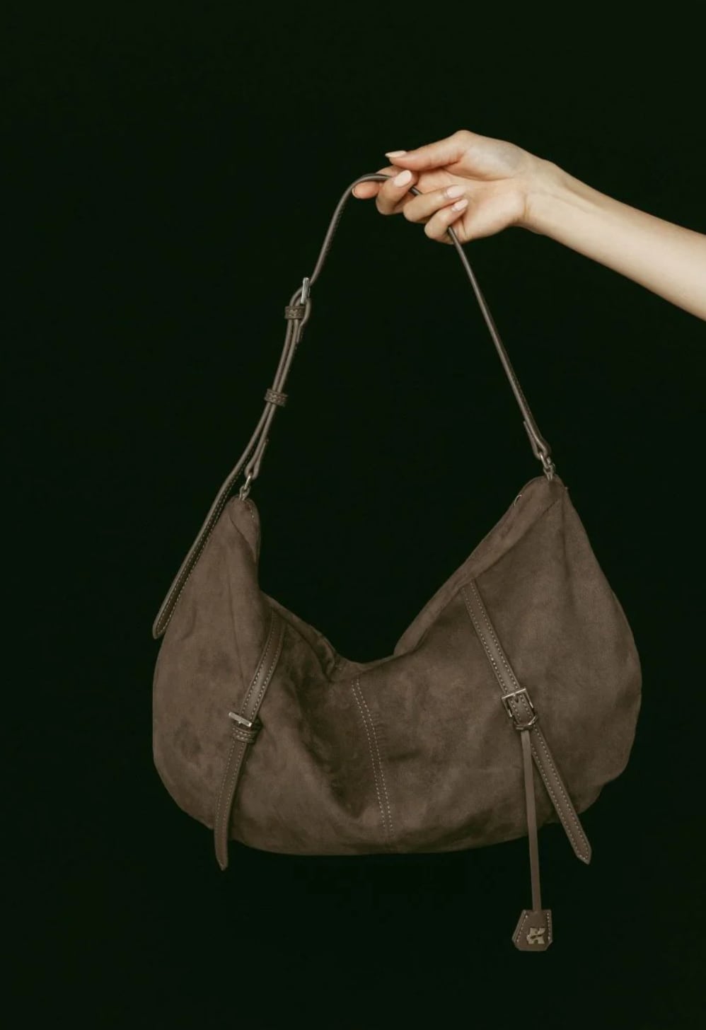 しっとりとしたスウェードの質感を、滑らかな半月型に落とし込んだバッグ。