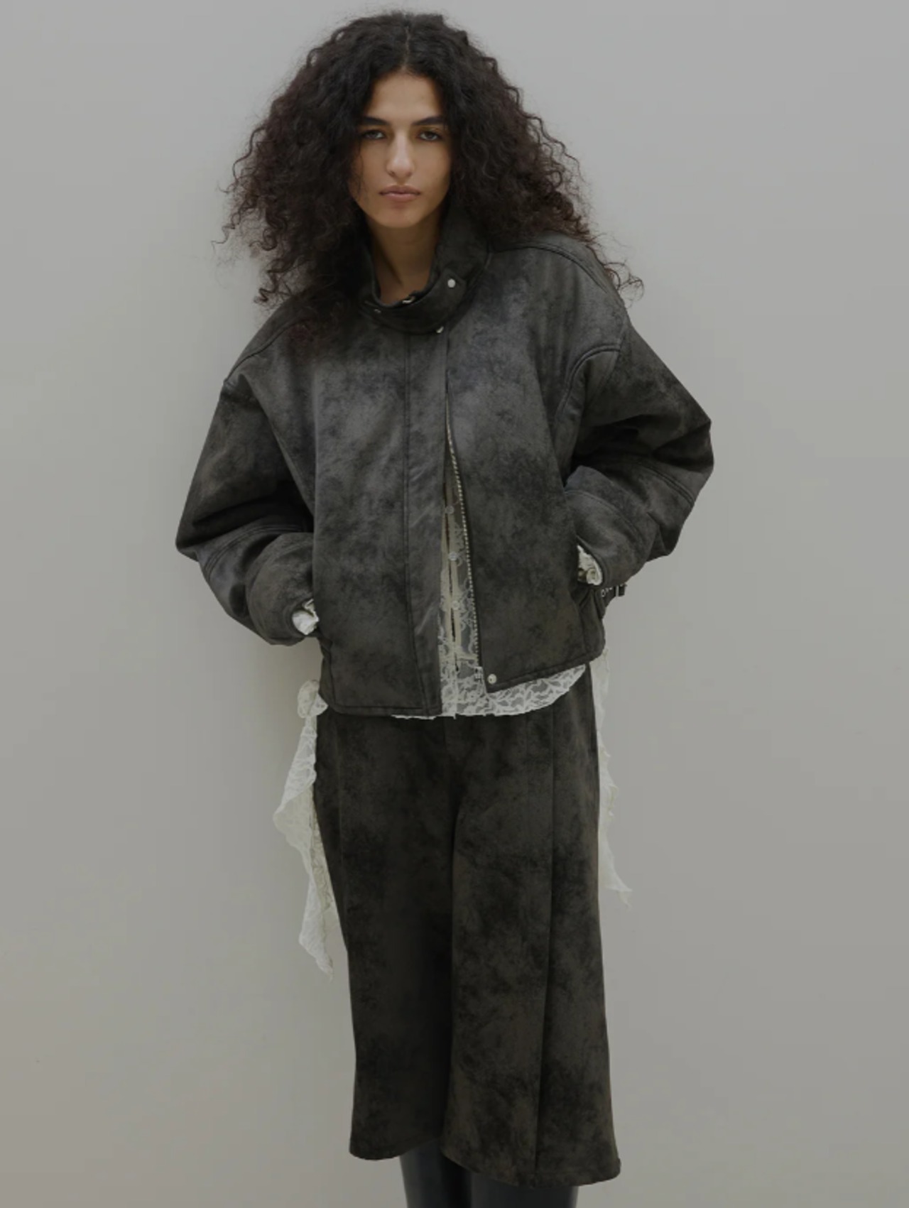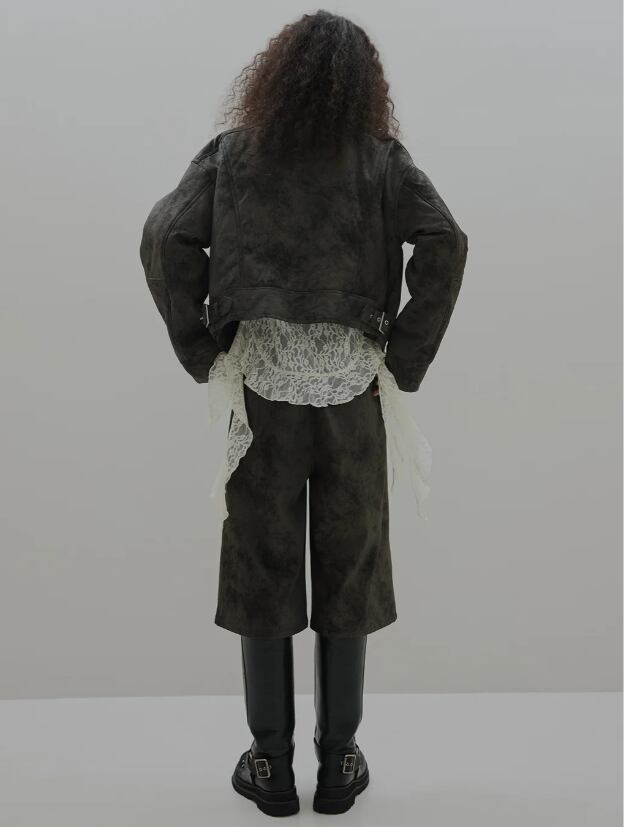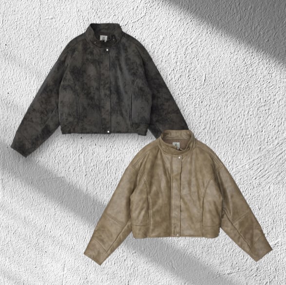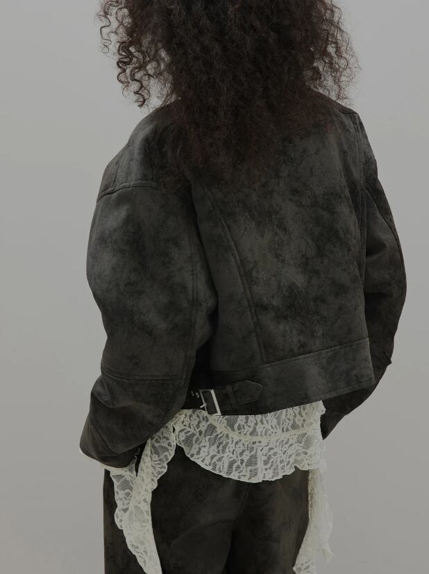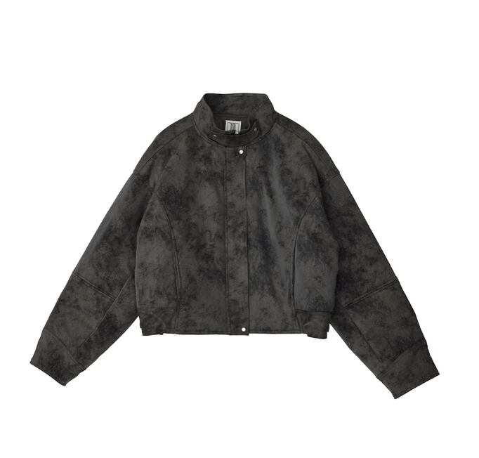 オリジナルシンセティックレザーとクラッシュスエードの中綿入りジャケット。