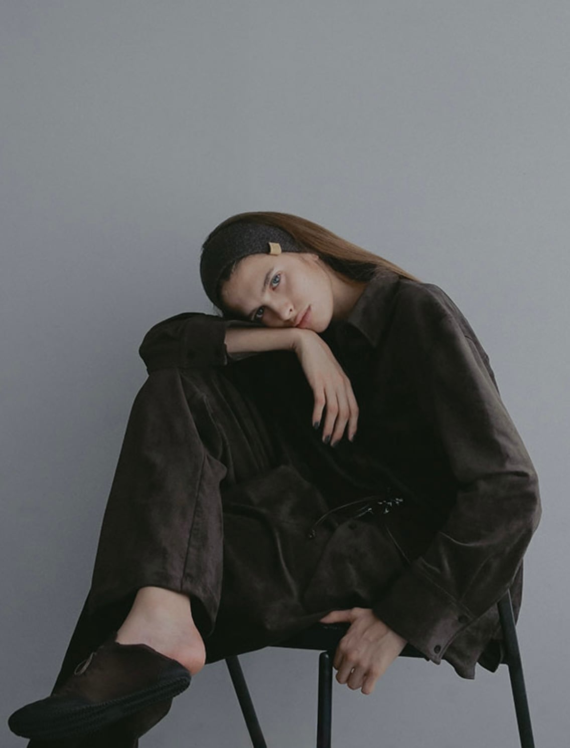 ほんのり起毛したスウェードタッチのポリエステル生地にポリウレタンをブレンドし、柔らかくしなやかな落ち感を実現。
