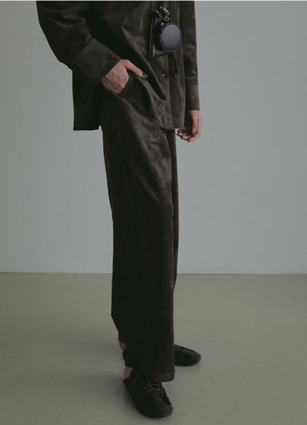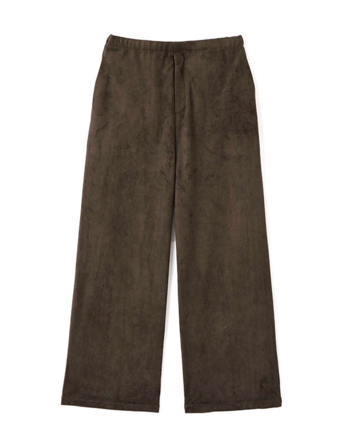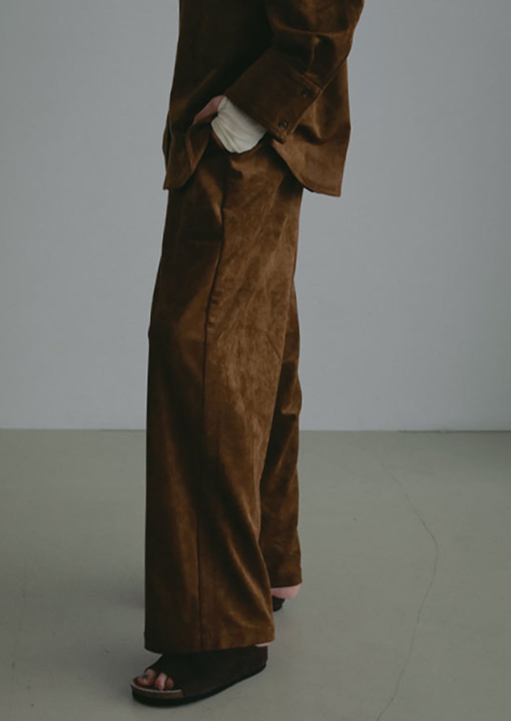 しっとりと肌に寄り添うようなフェイクスウェード素材が魅力のリラクシングなパンツ。