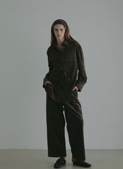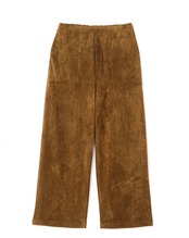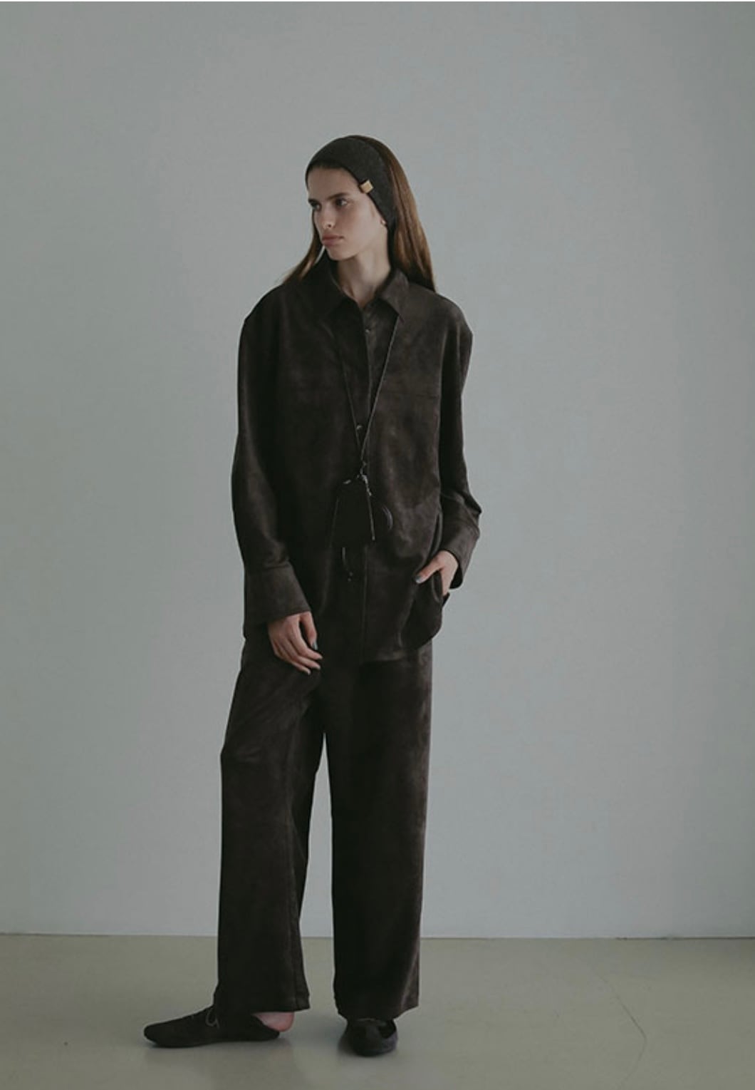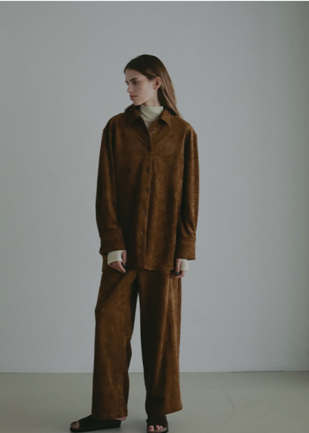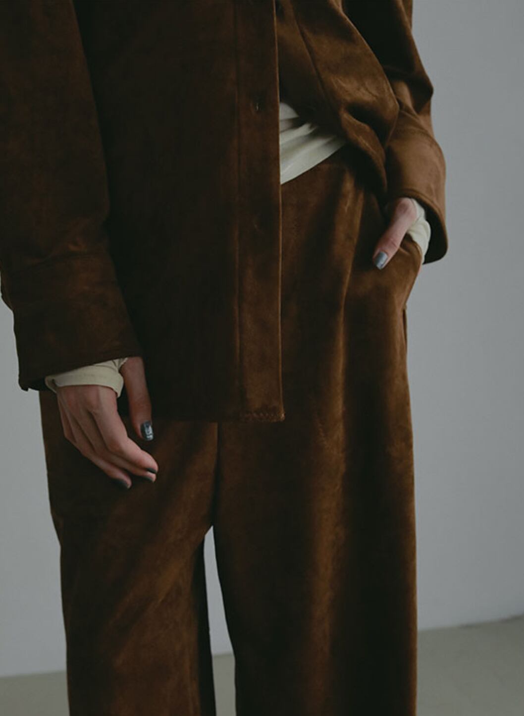 しっとりと肌に寄り添うようなフェイクスウェード素材が魅力のリラクシングなパンツ。