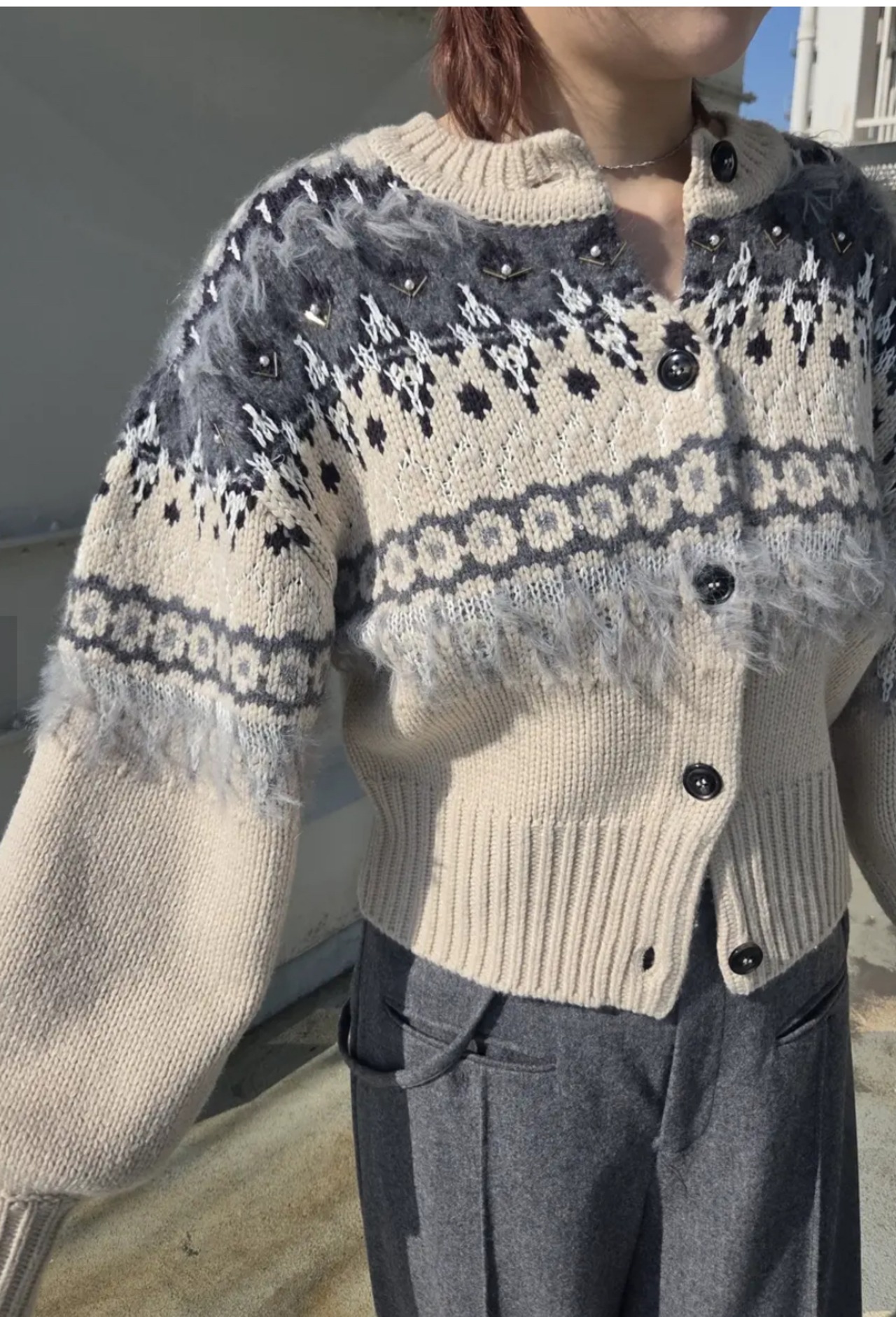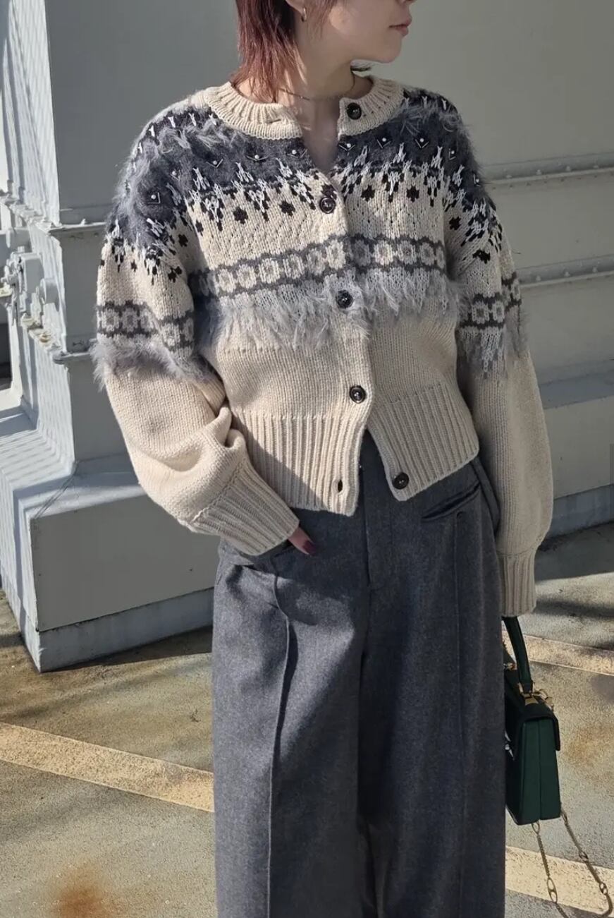 パールやビーズ、スパンコール、シャギーの糸を織り混ぜ、他にはない女性らしいノルディック柄の編み地に拘ったアイテム。