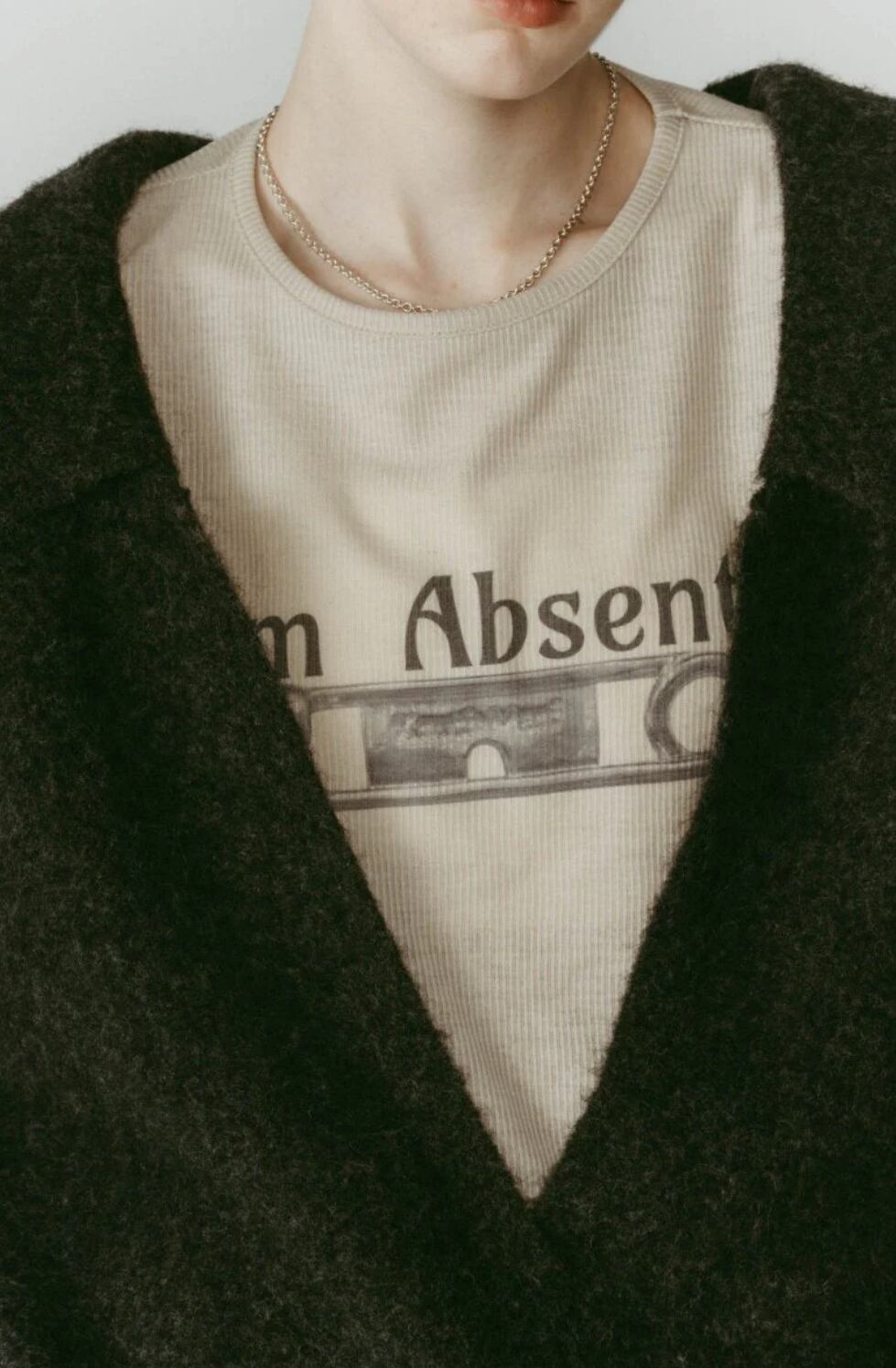 シンプルな装いの中で構築的な美しさを感じさせる、存在感のある一枚。