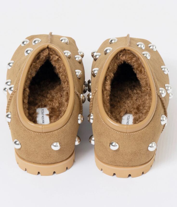 ヒールを包み全体的なボリュームを出したシルエット×スタッズ×サボを組み合わせ、他にはないメゾンスペシャルらしい一足に仕上げております。