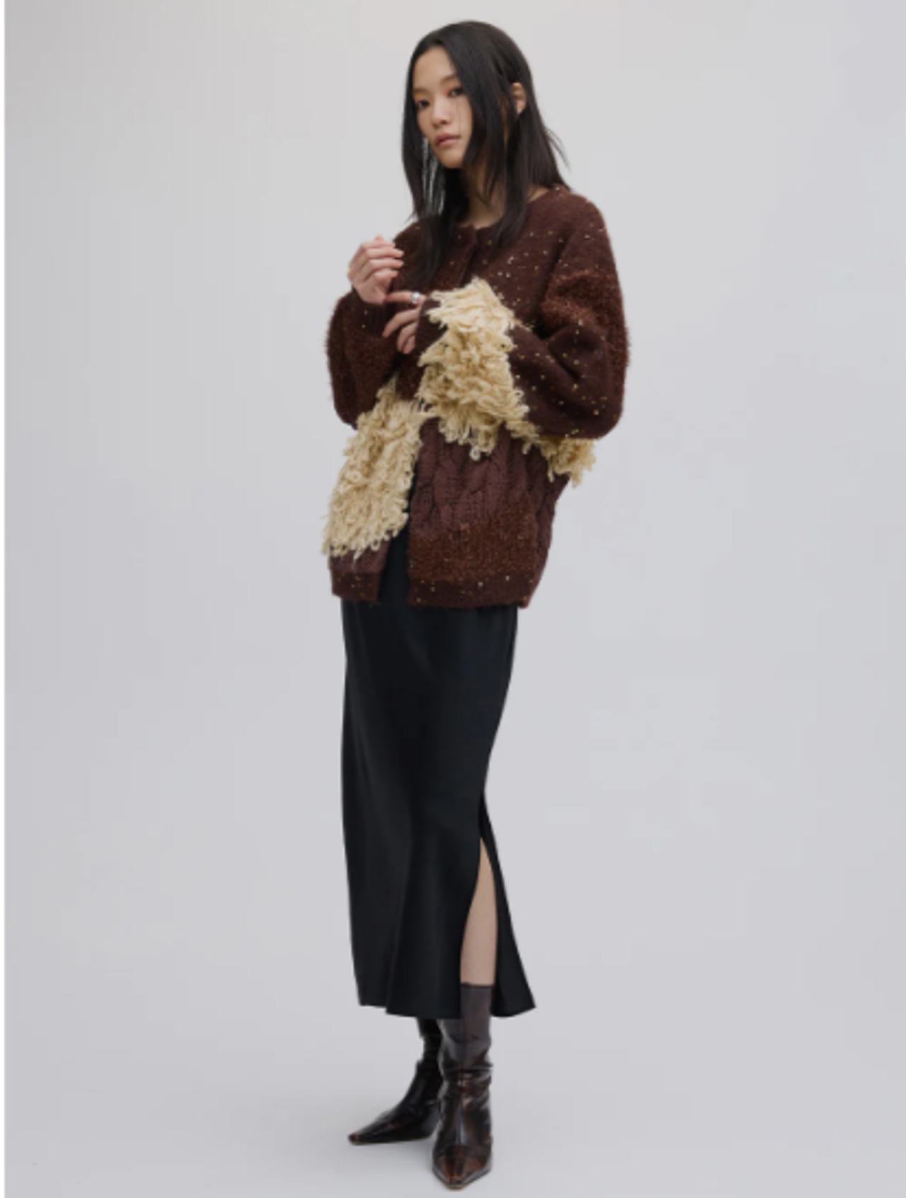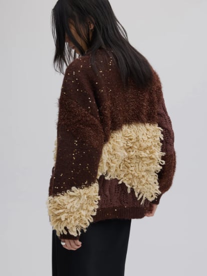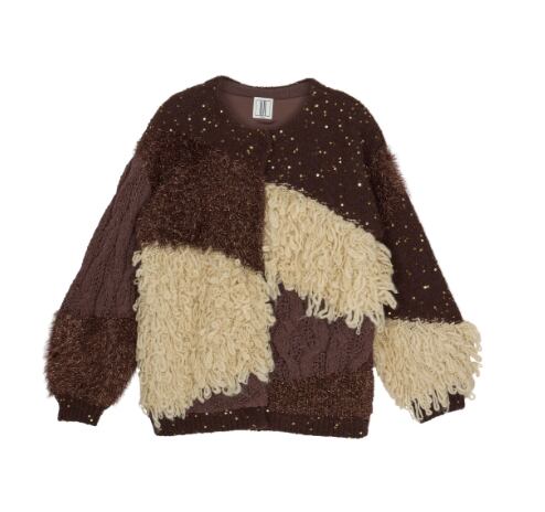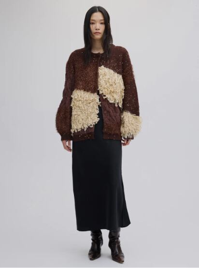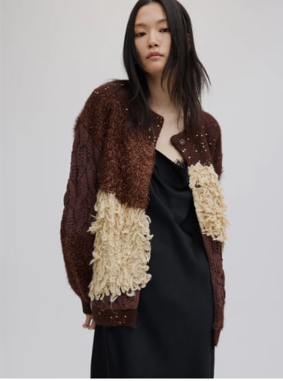 4種類の編地をパッチワーク風に組み合わせたニットカーディガン。