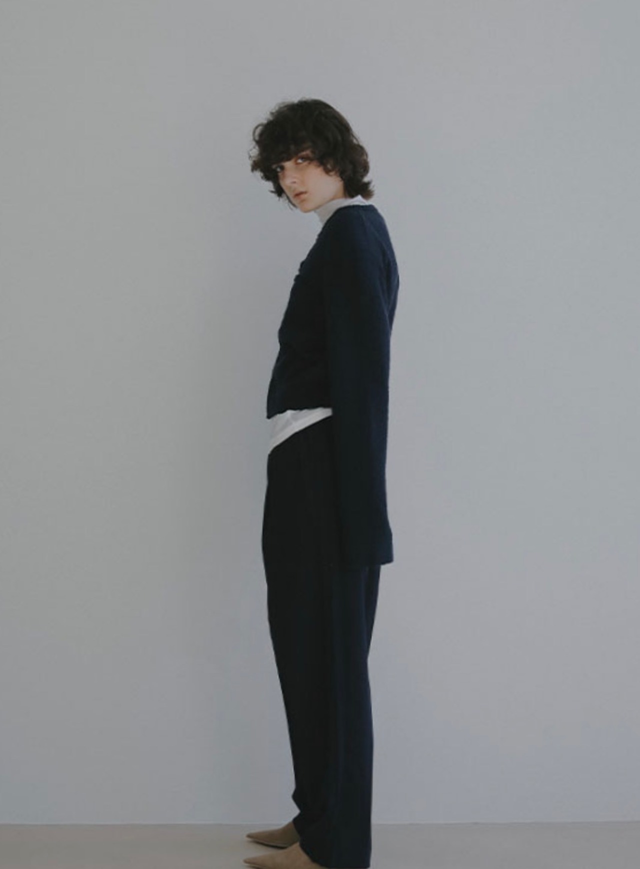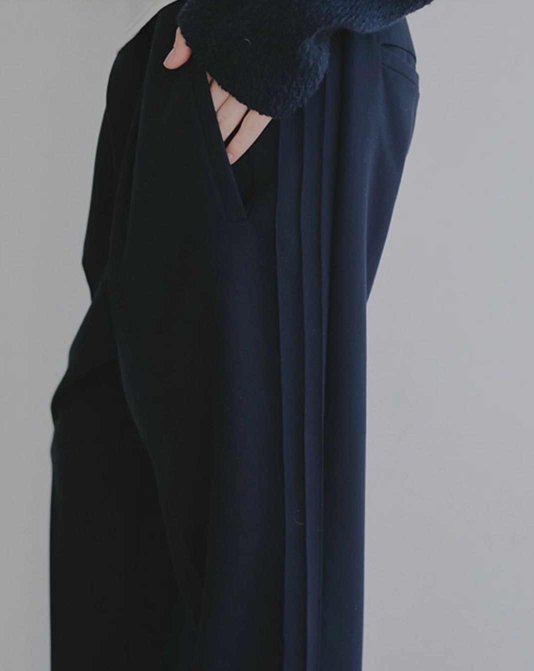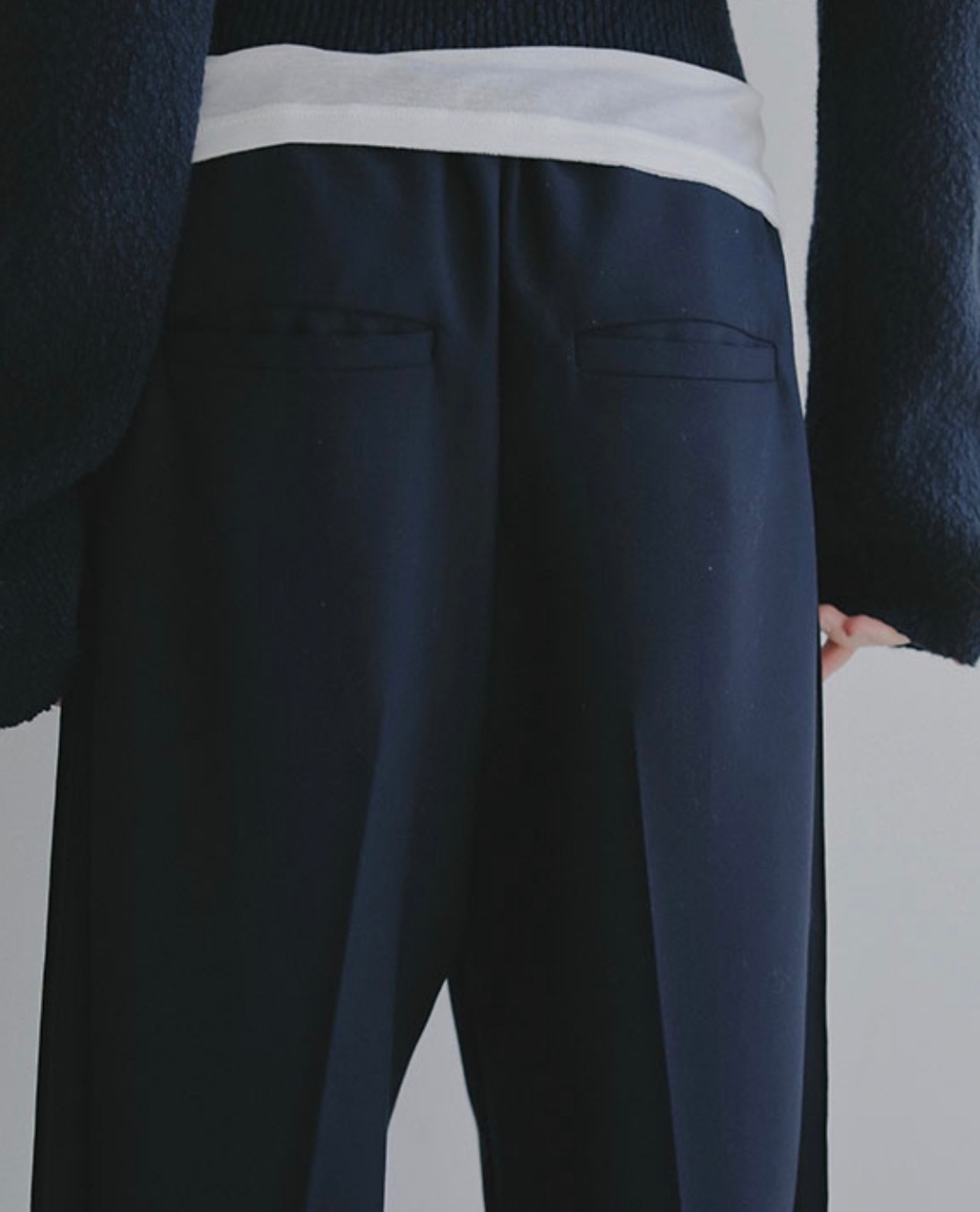 サイドに施したピンタックが縦のラインを強調し、イージーな履き心地のパンツでありながらも全体をすっきりとした印象に導きます。