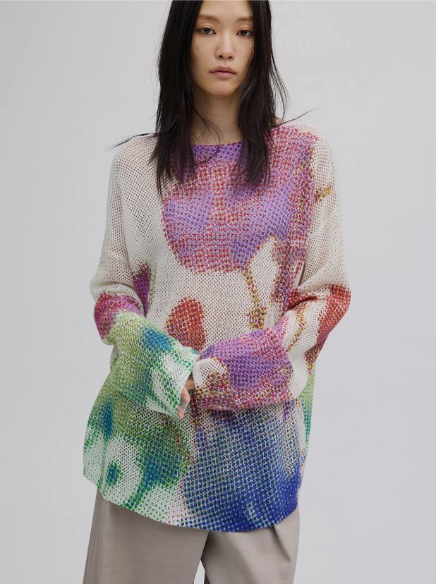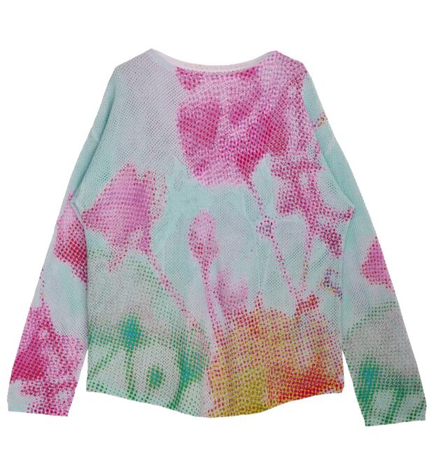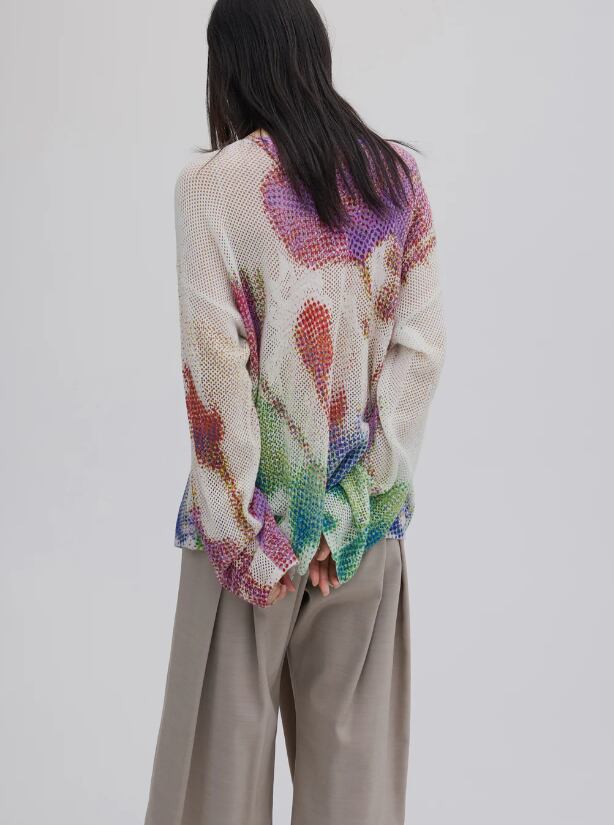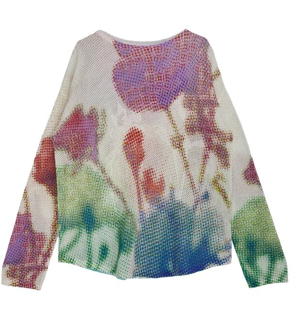 メッシュ編みのニットにプリントすることで、さらに粗くぼんやりと見せた1着。
