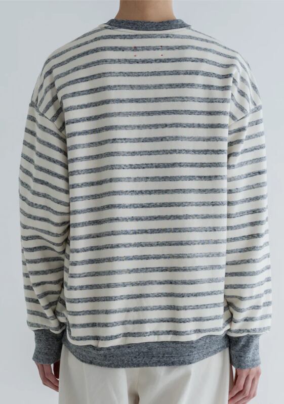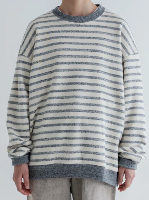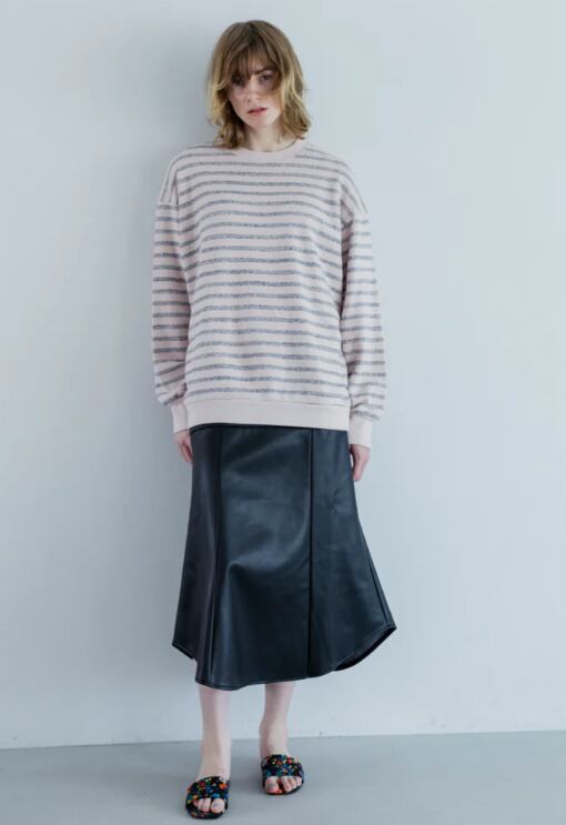 定番の SWITCHING PATTERN SWEATと同じ形で、着ると少し丸みを帯びるのでバランスが取りやすく、LOOK のようにスカートとのスタイリングはもちろんのこと、ワイドパンツなど様々なボトムスと合わせやすいシルエットです。