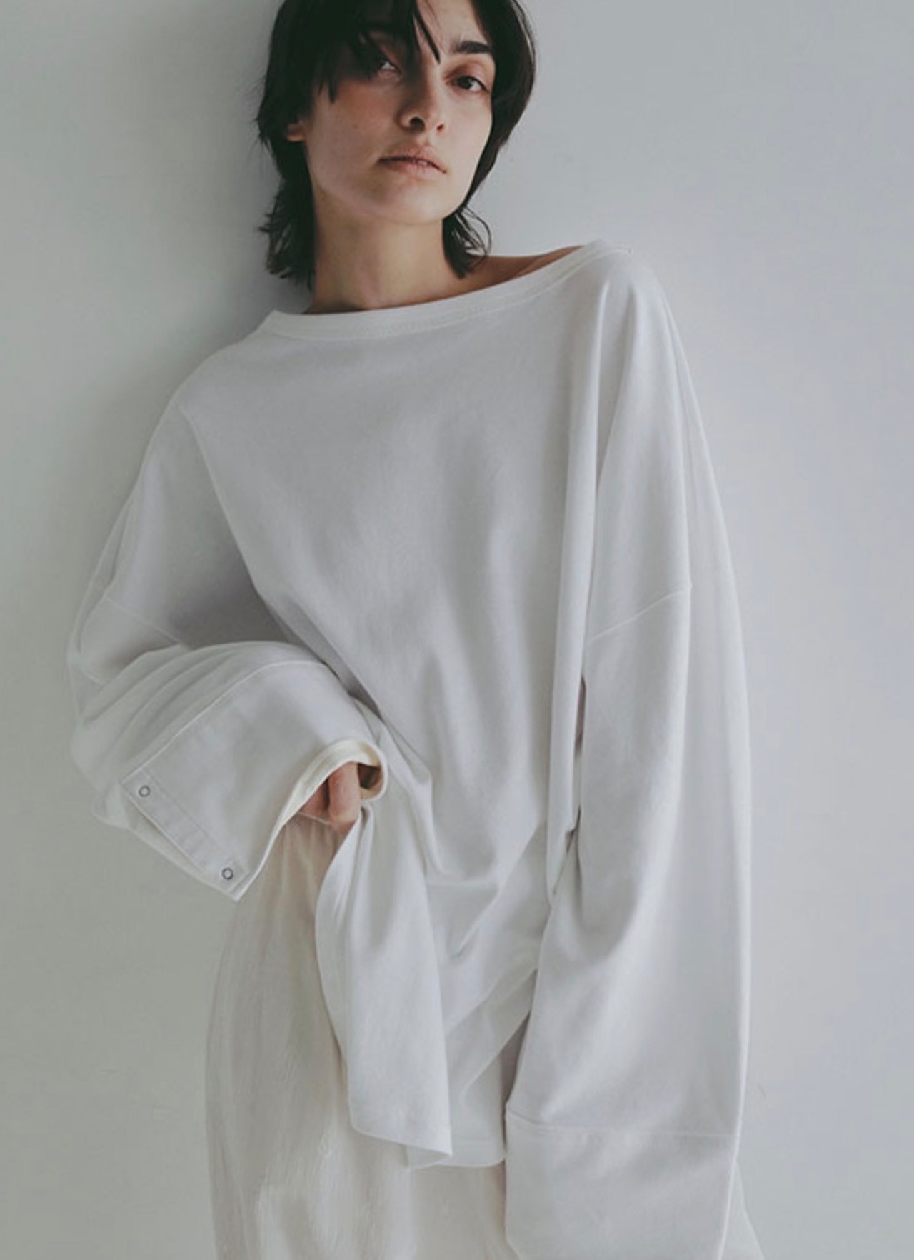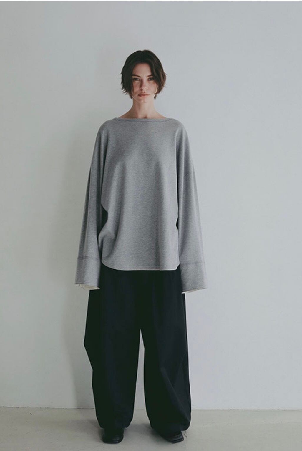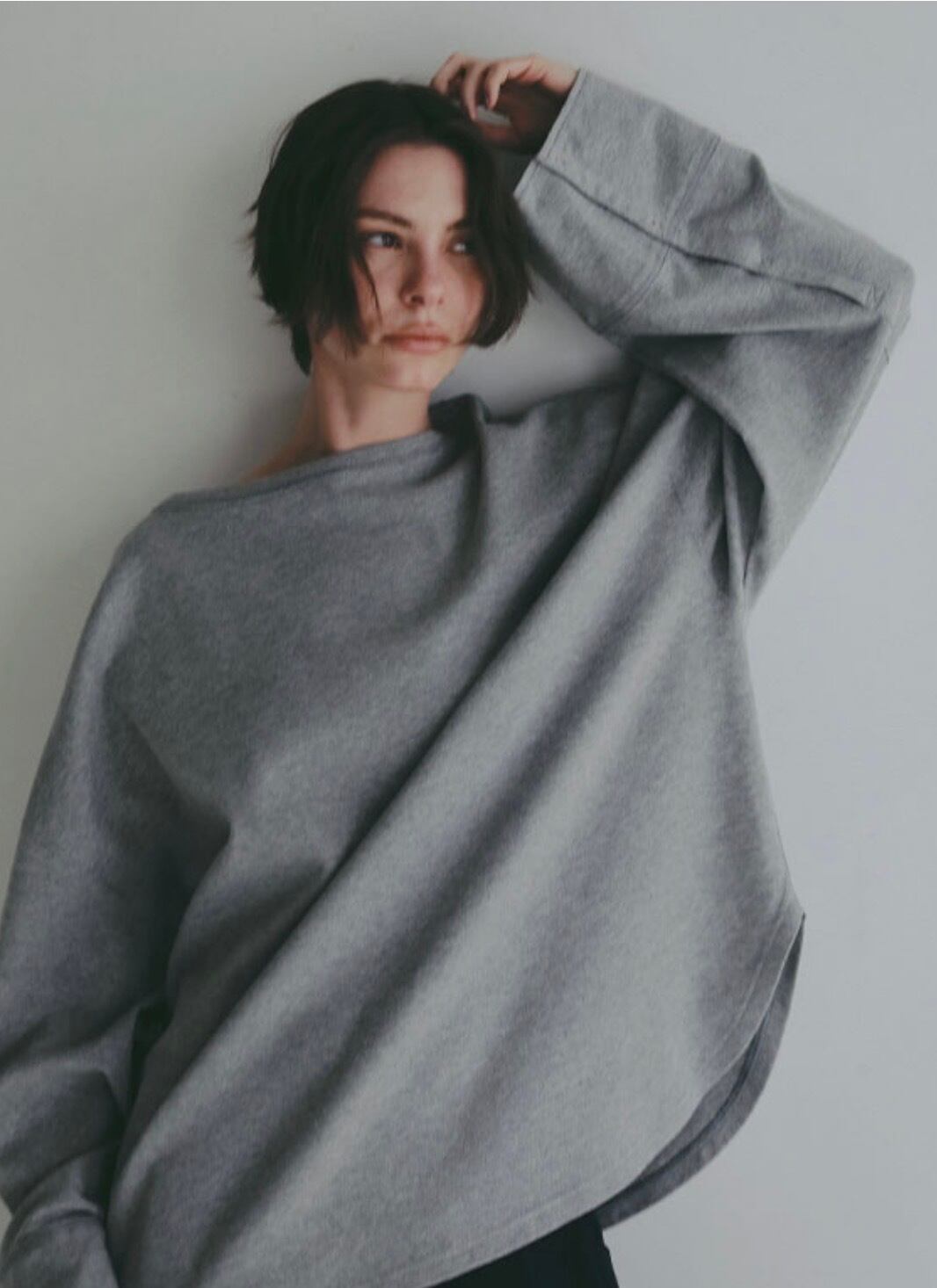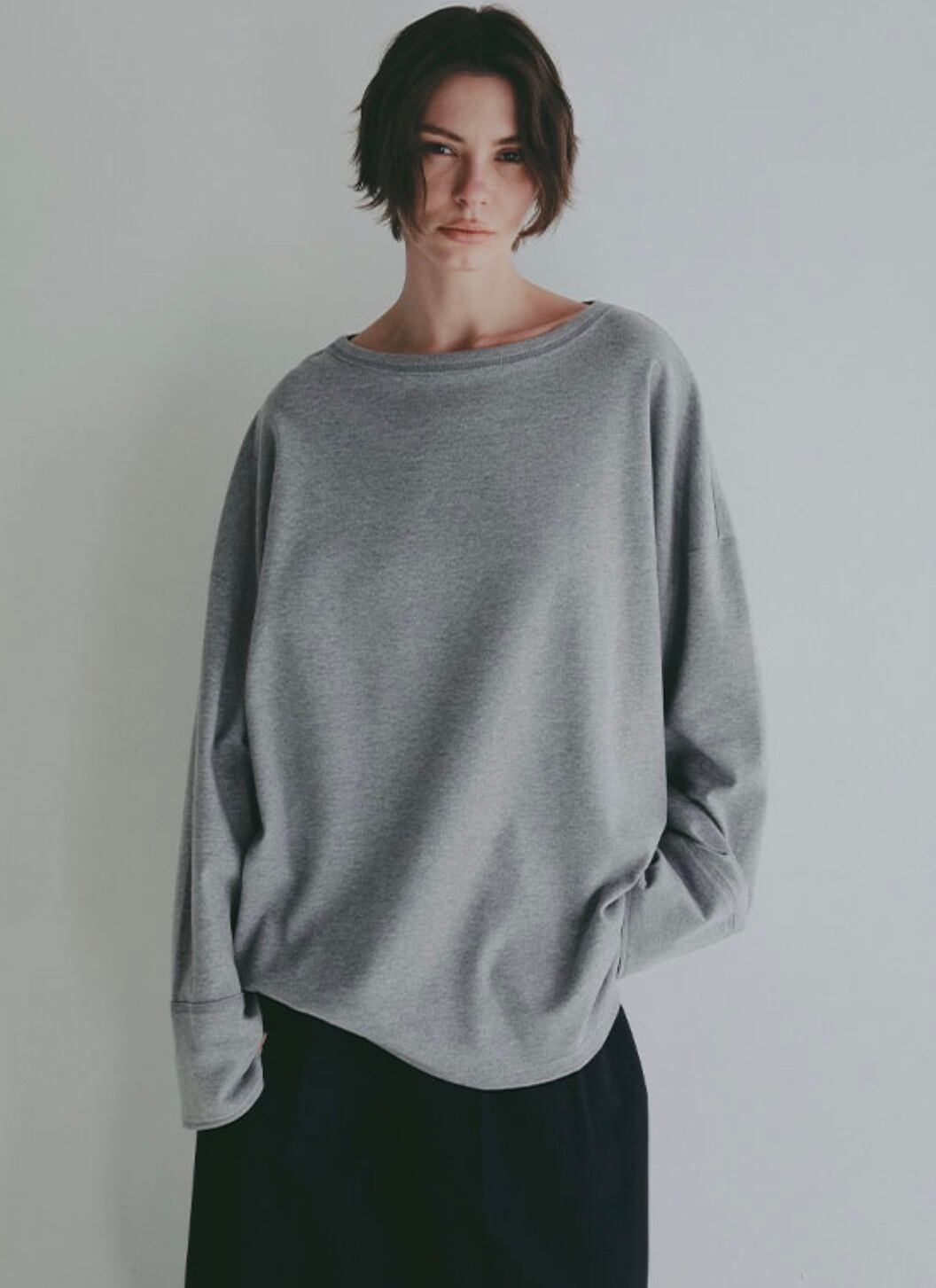 ゆとりを持たせたシルエットと、デコルテを美しく見せるボートネックデザインが特徴。