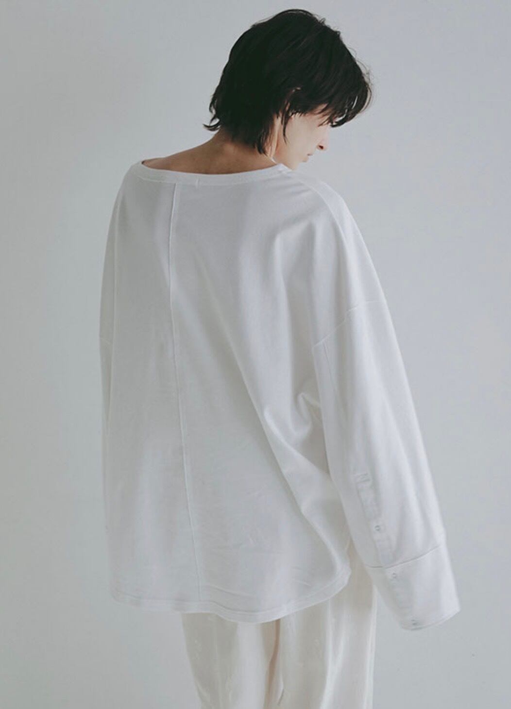 肩のラインをなだらかに落とし、身体のラインを拾いすぎないリラックス感のあるフォルムに仕立てました。