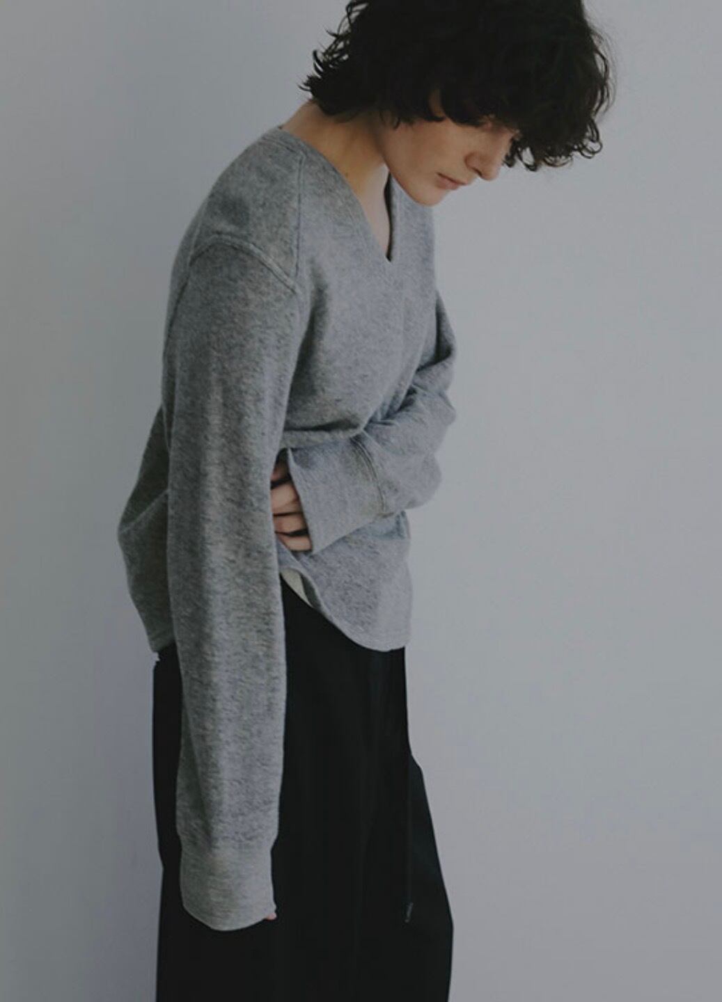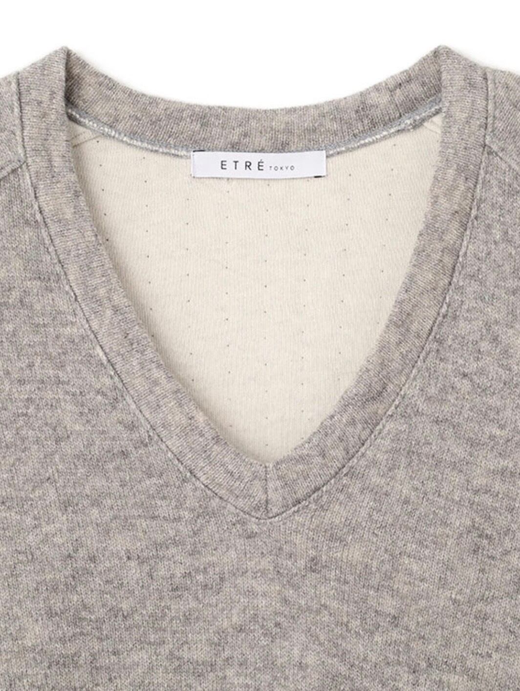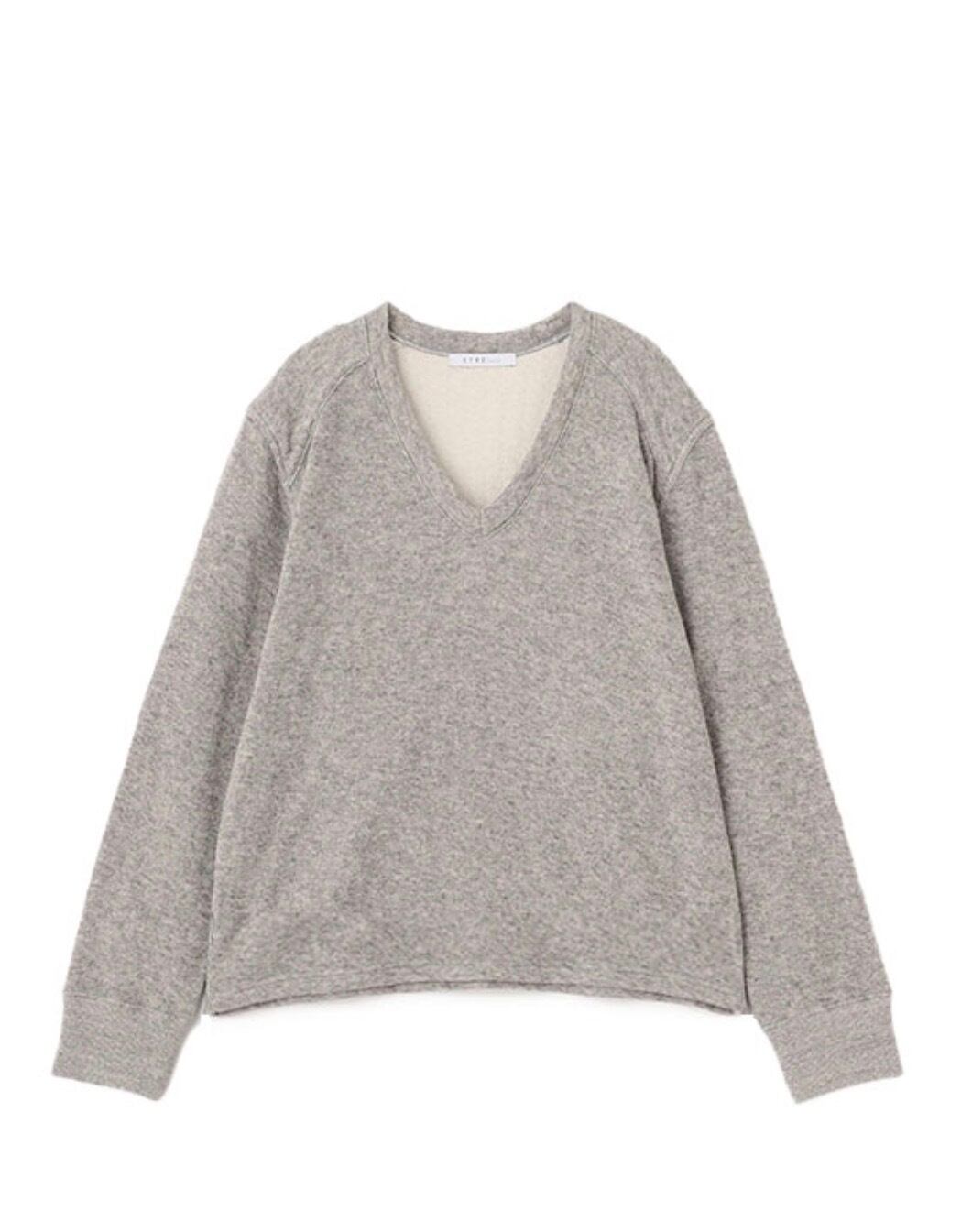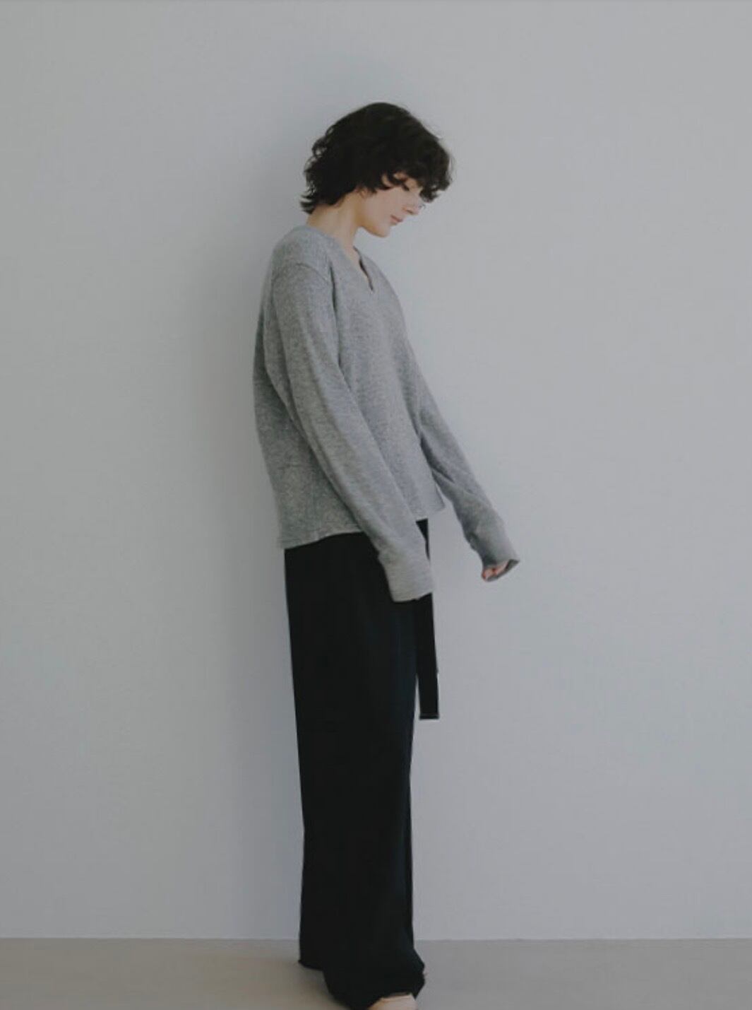 浅めに設定したVネックは、デコルテをすっきりと見せつつも開きすぎないバランスでレイヤードもしやすく、ほどよく女性らしい印象をプラス。