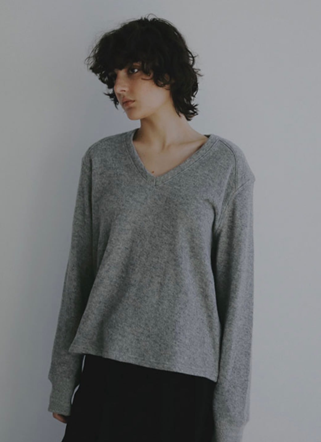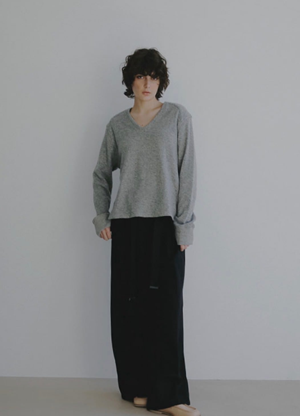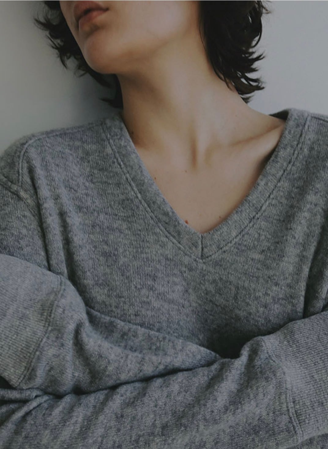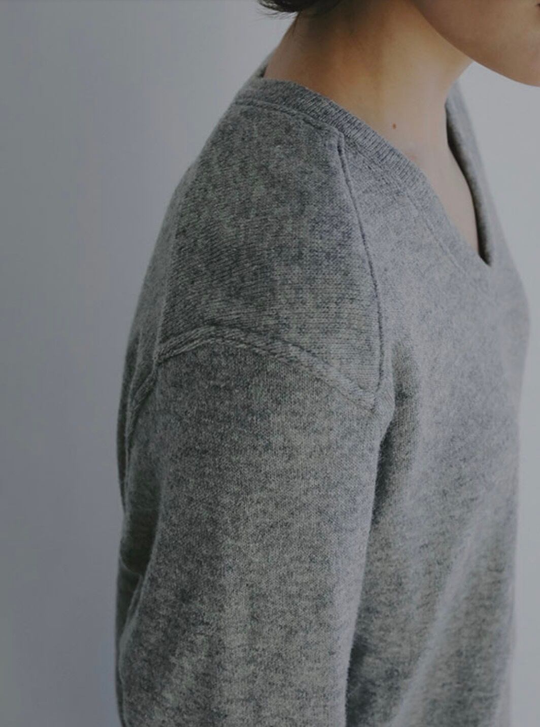 浅めに設定したVネックは、デコルテをすっきりと見せつつも開きすぎないバランスでレイヤードもしやすく、ほどよく女性らしい印象をプラス。