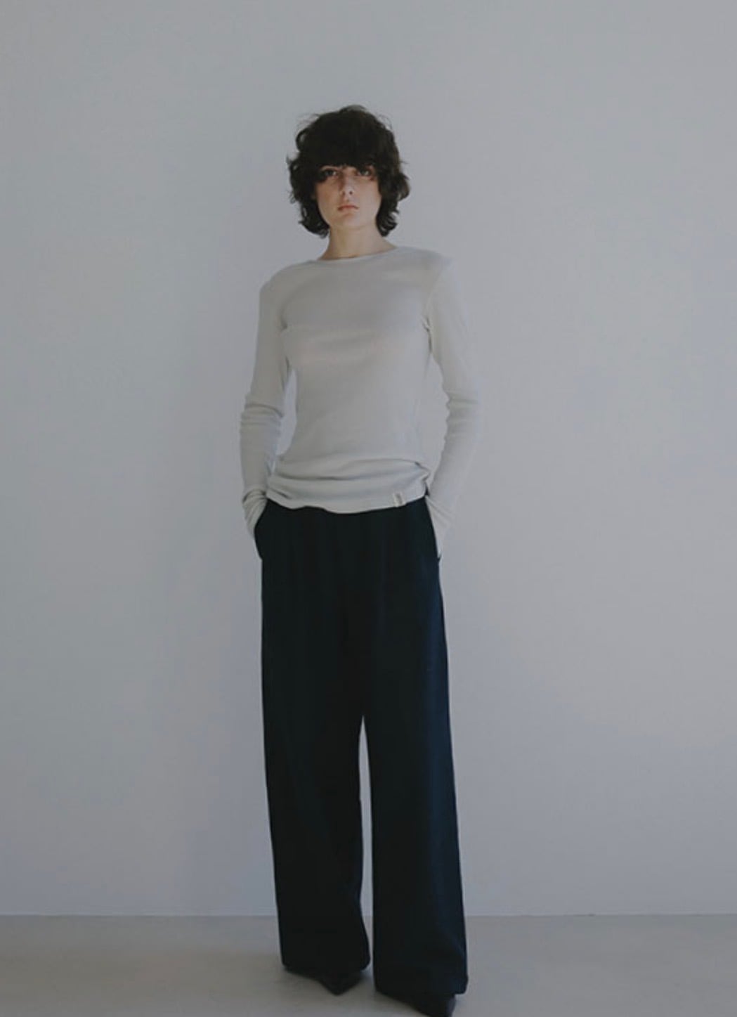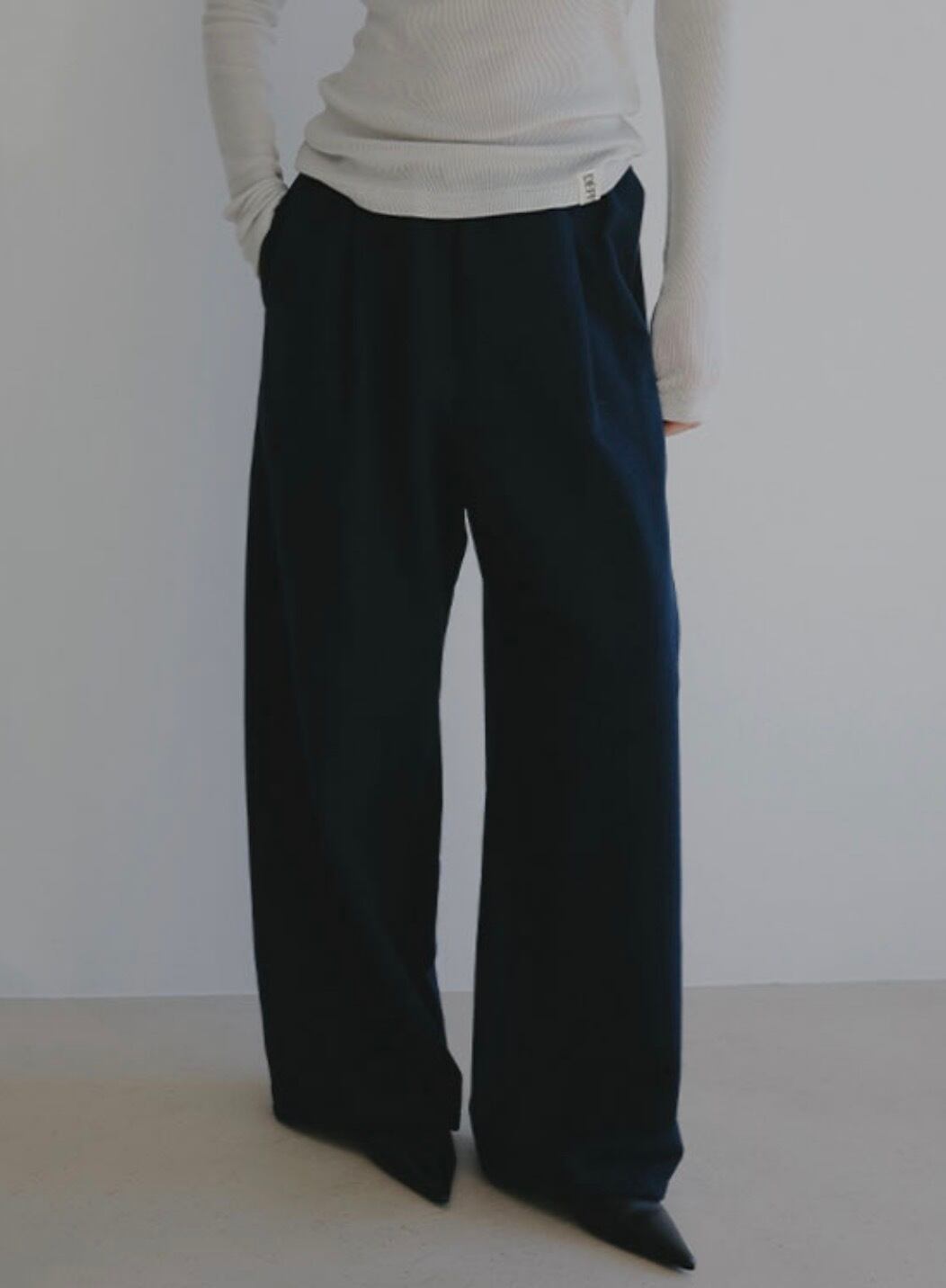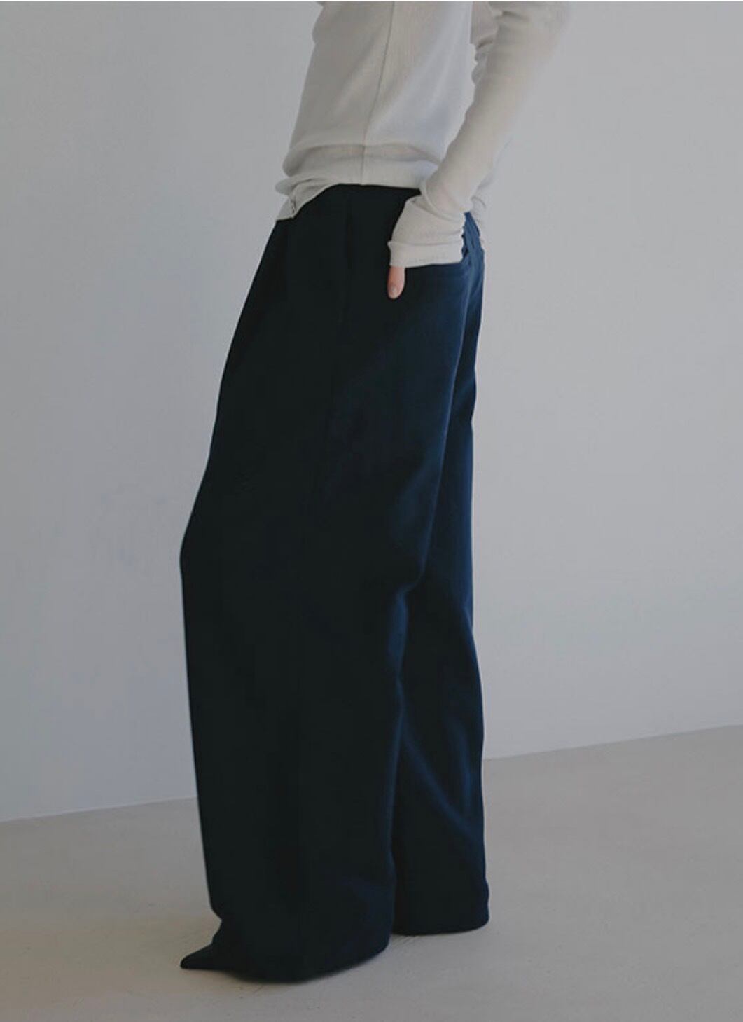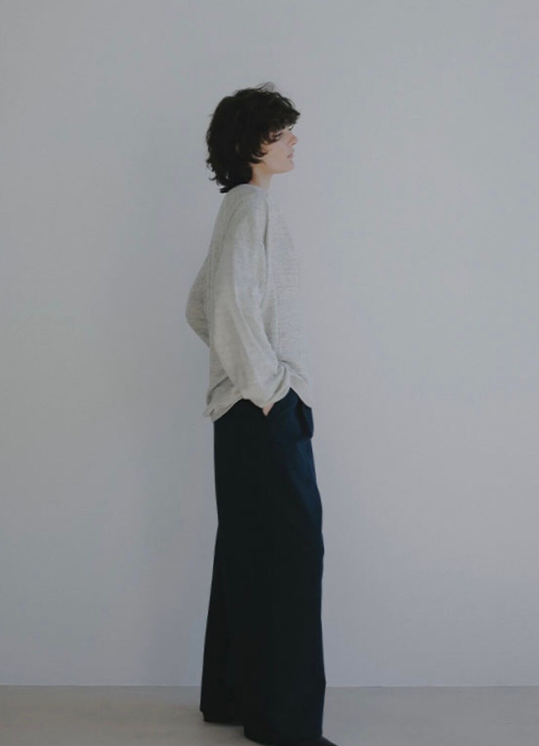 シンプルなカットソーやリブトップスを合わせたミニマルなスタイリングから、ニットやシャツをレイヤードした奥行きのある着こなしまで幅広く対応する一本です。