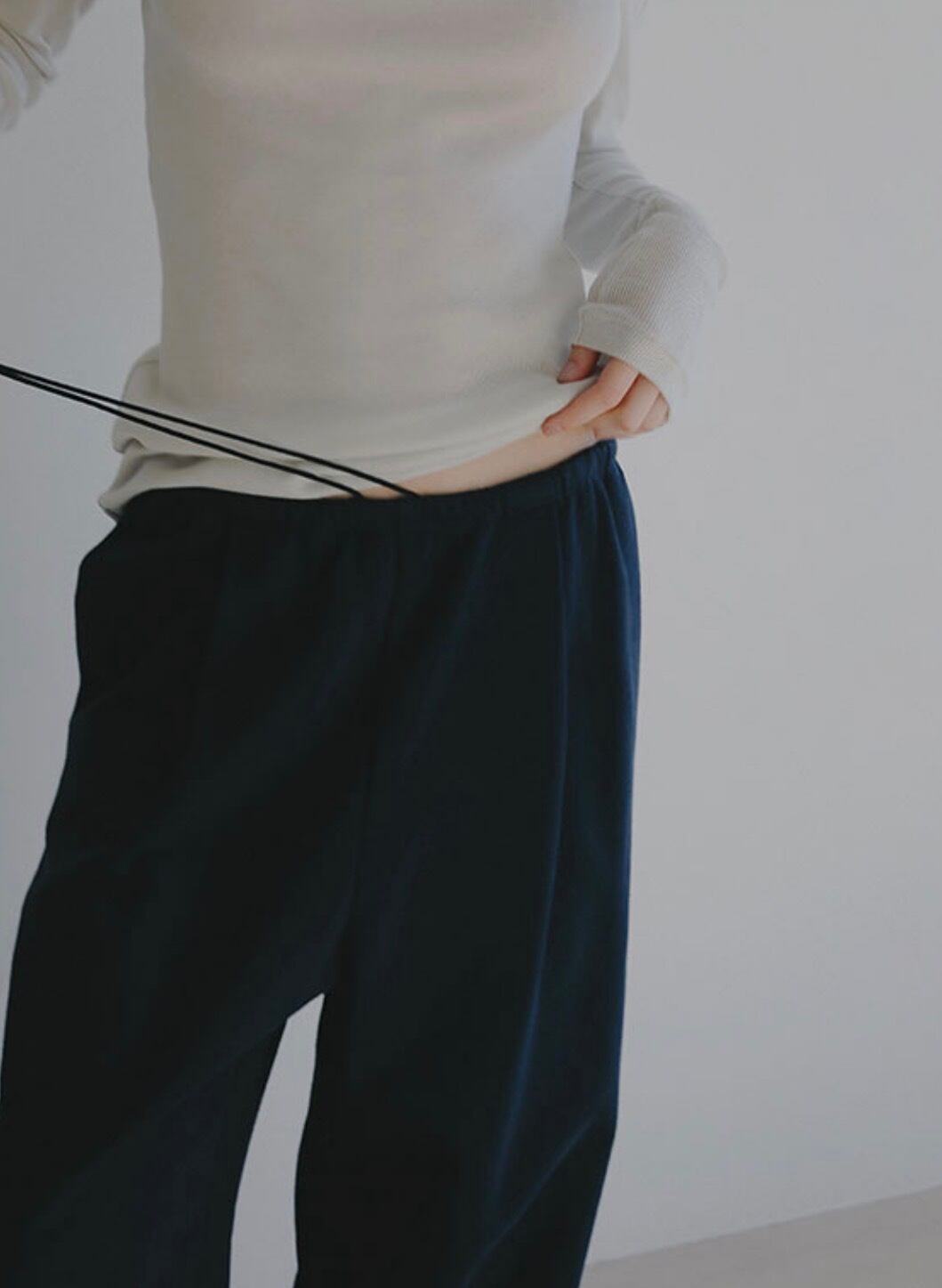 裾にはスピンドルを配しているため、ストレートシルエットとしてそのまま着用するのはもちろん、裾を絞ってシルエットに変化をつけることも可能です。