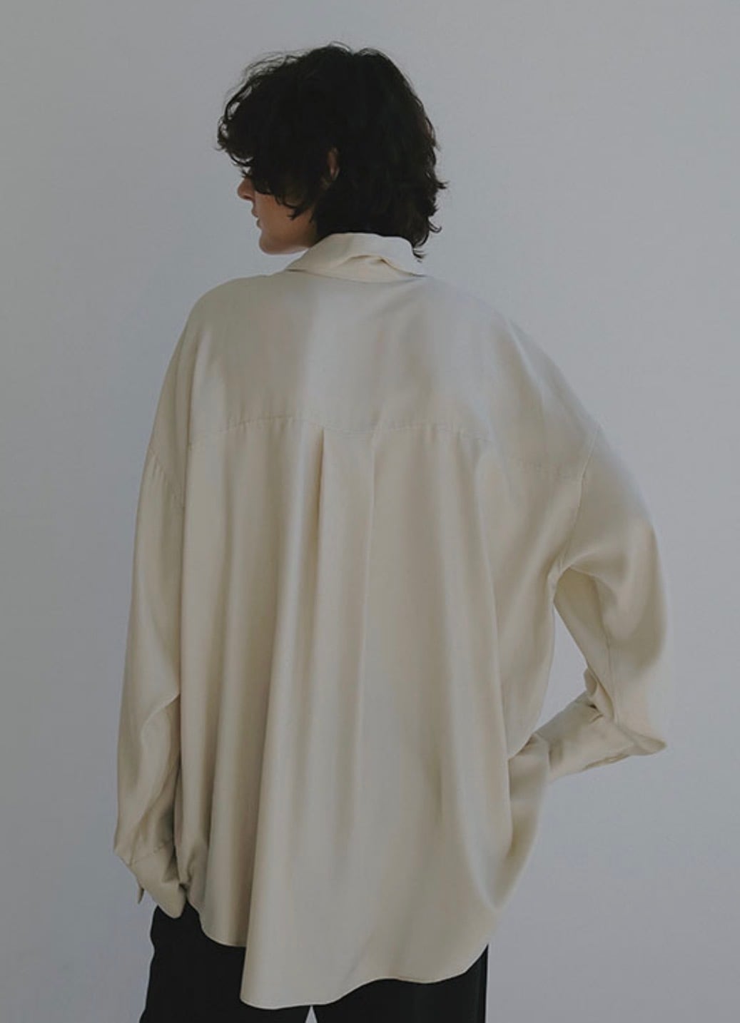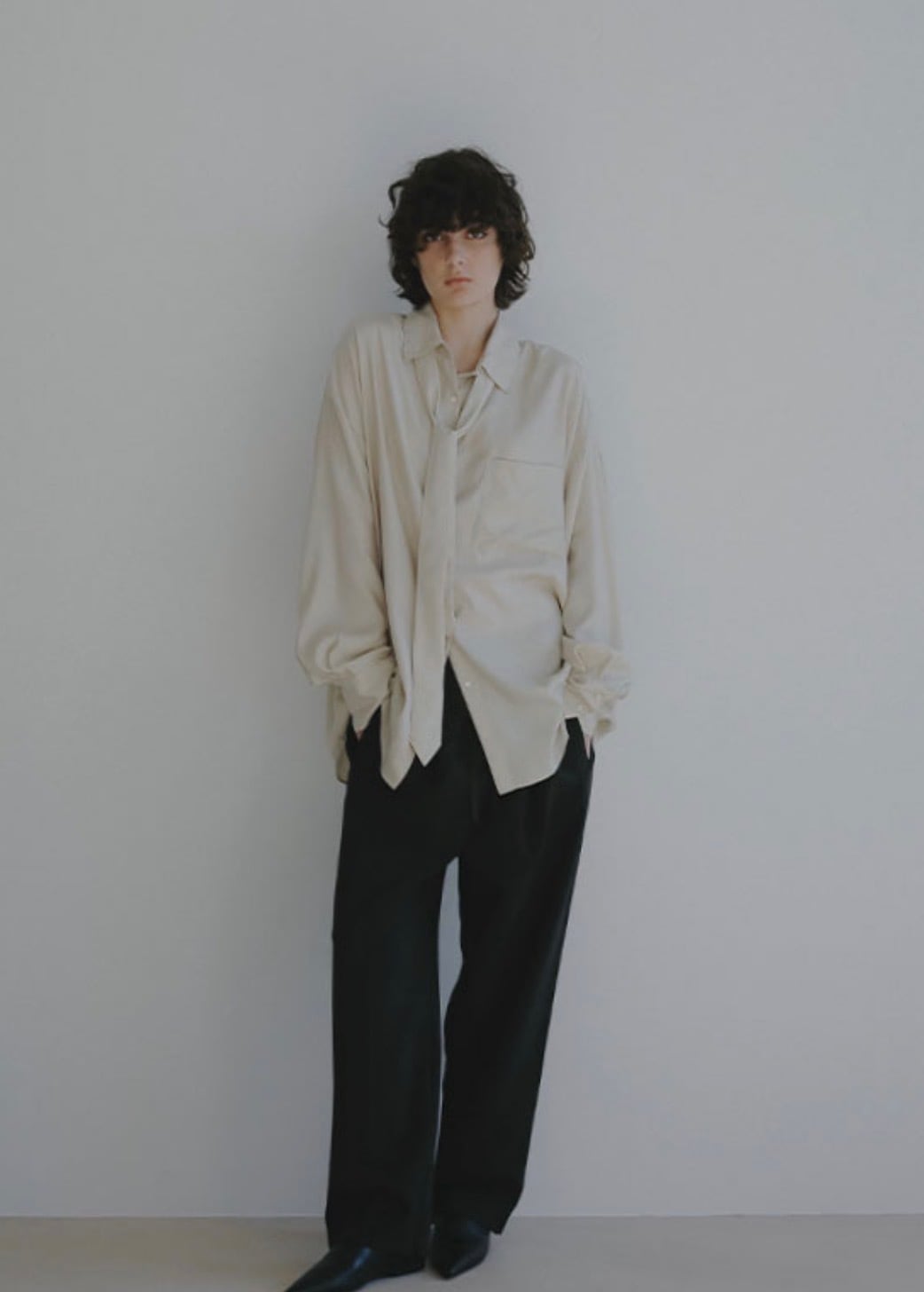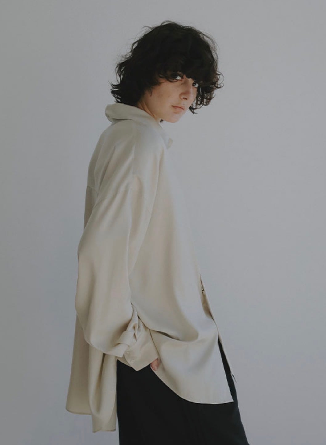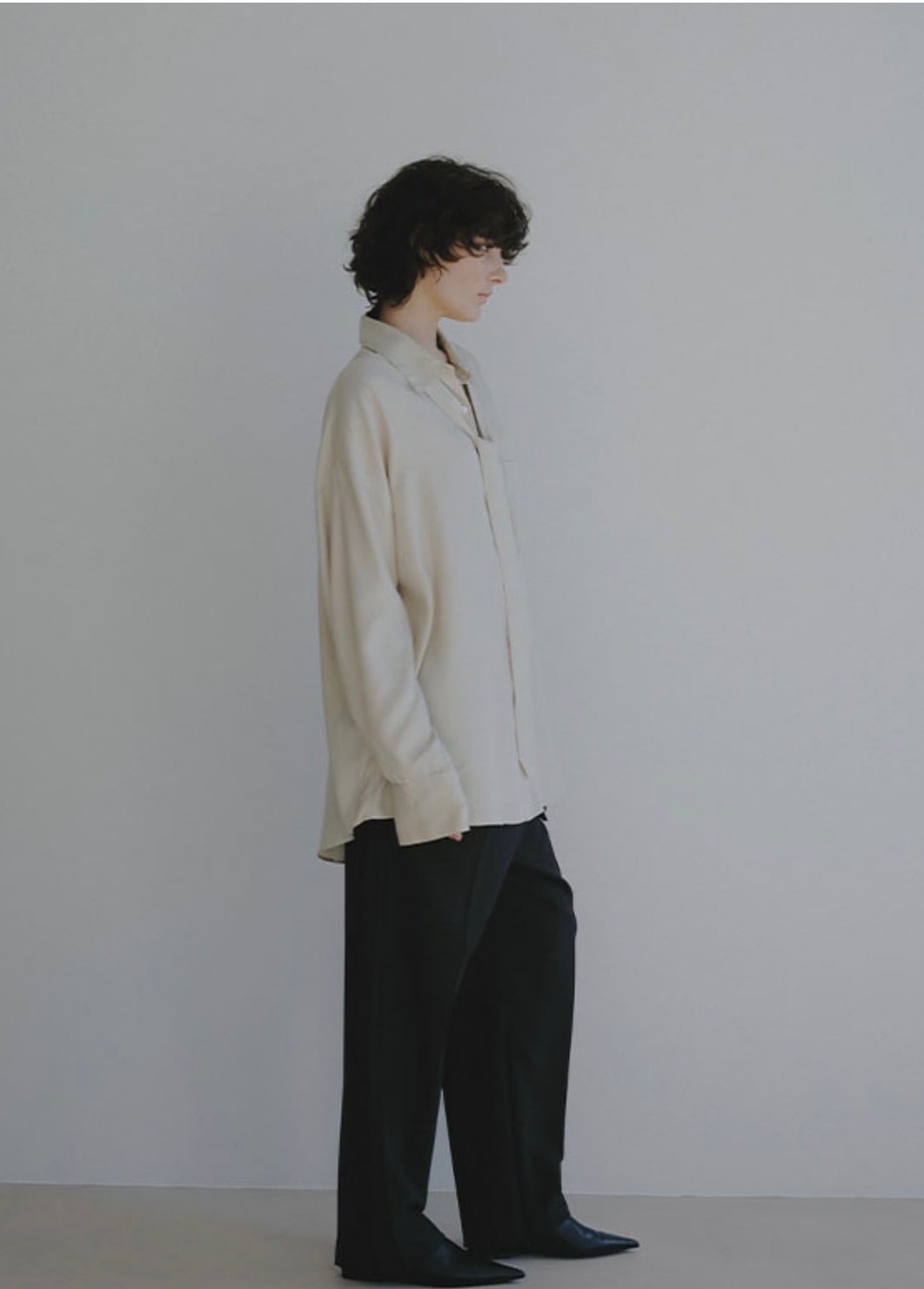 ほどよくゆとりを持たせたオーバーサイズめなシルエットながら、 素材の落ち感が加わることでリラックス感がありながらも品のある佇まいに仕上げています。