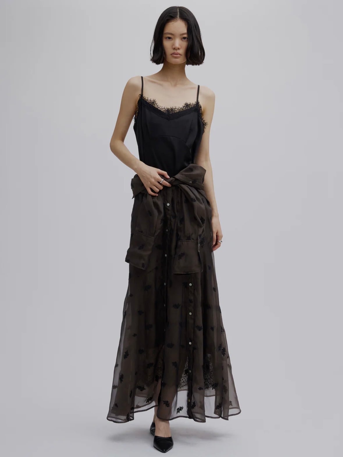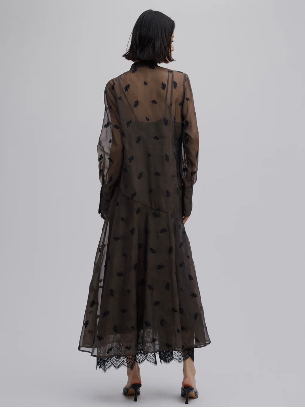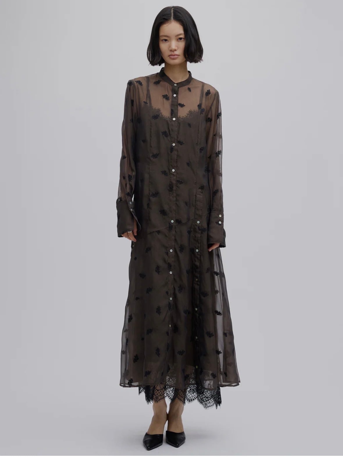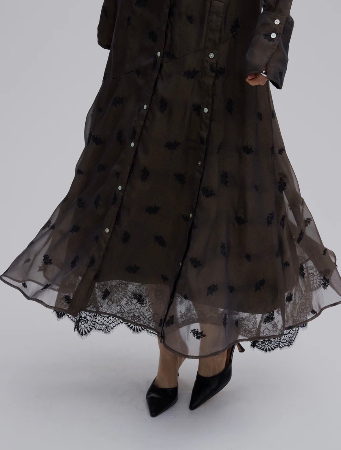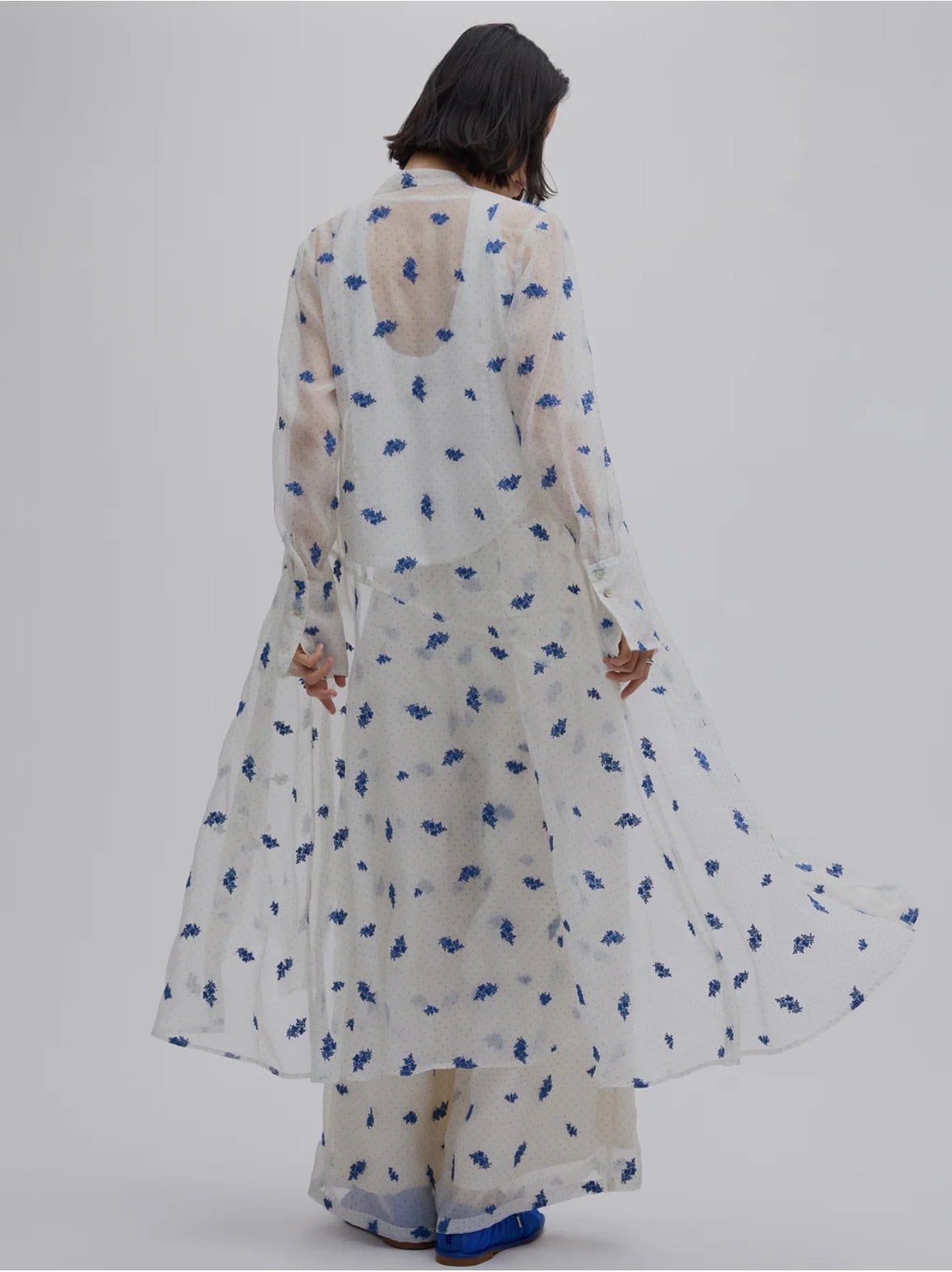 シアーのシフォン素材に小花柄刺繍とドットプリントを施し、春夏らしくキャッチーな見た目に。