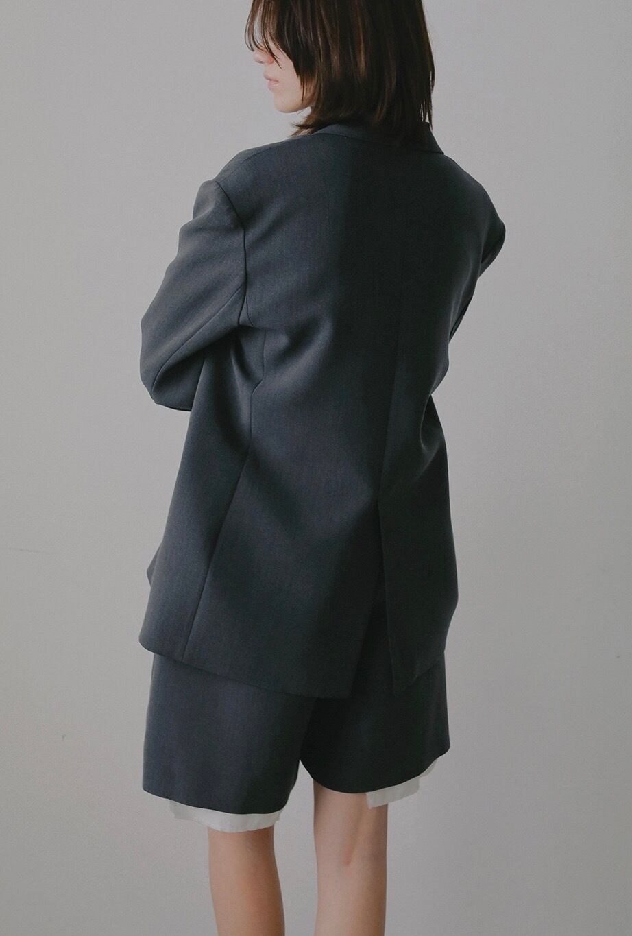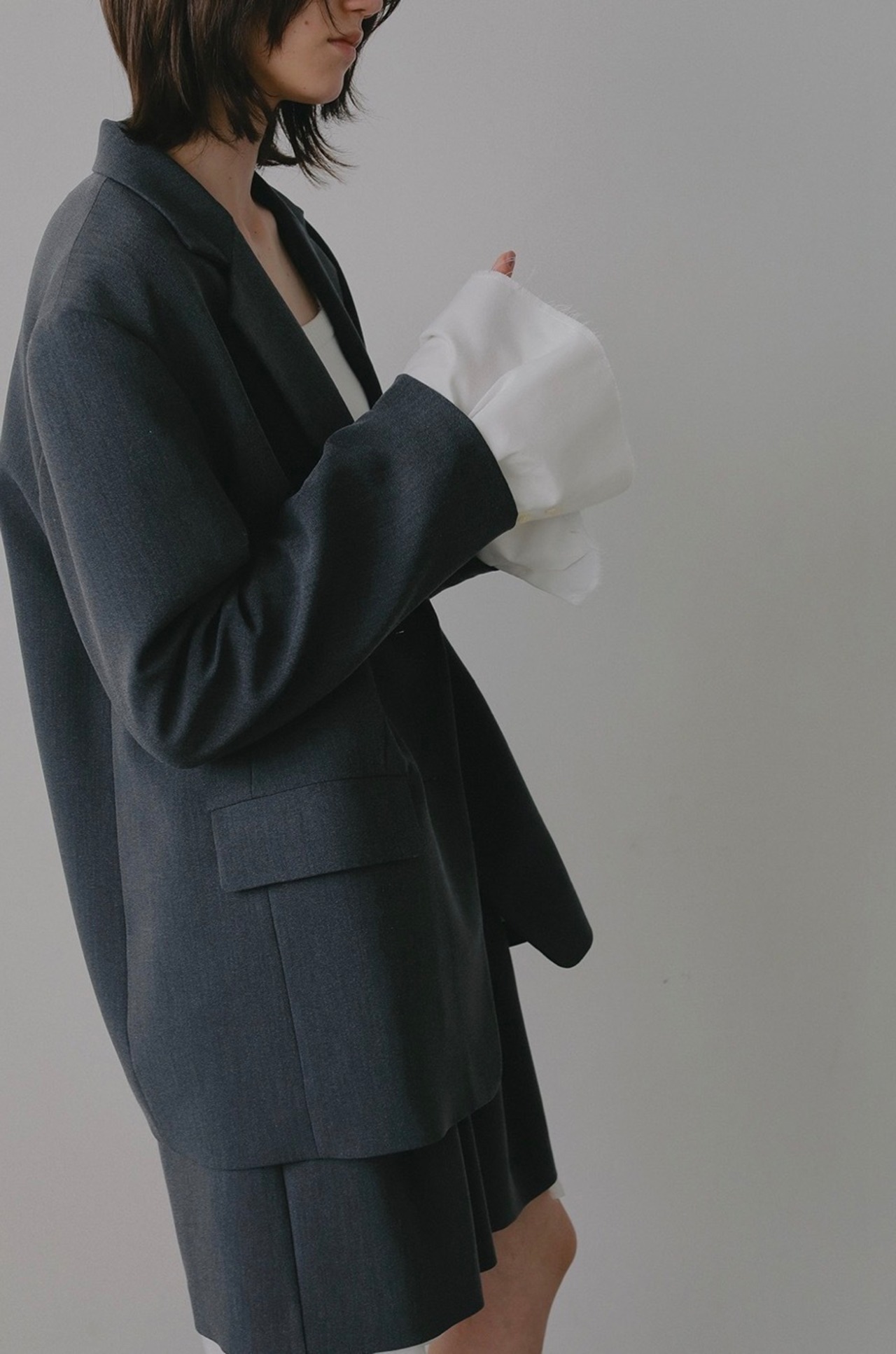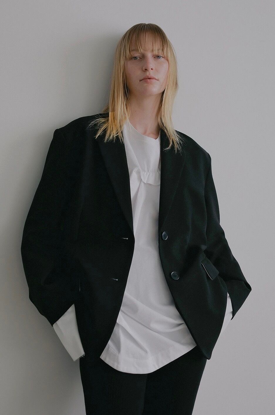ハリのあるスパンタッチのマットなダブルクロス素材を使用し、きちんとした見え感ながらも肩を落とした抜け感のあるシルエットが魅力。