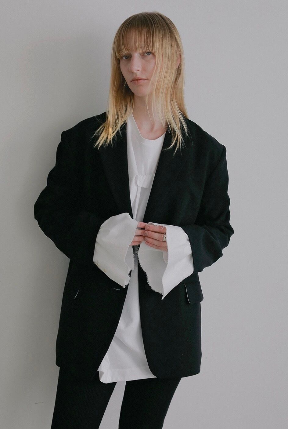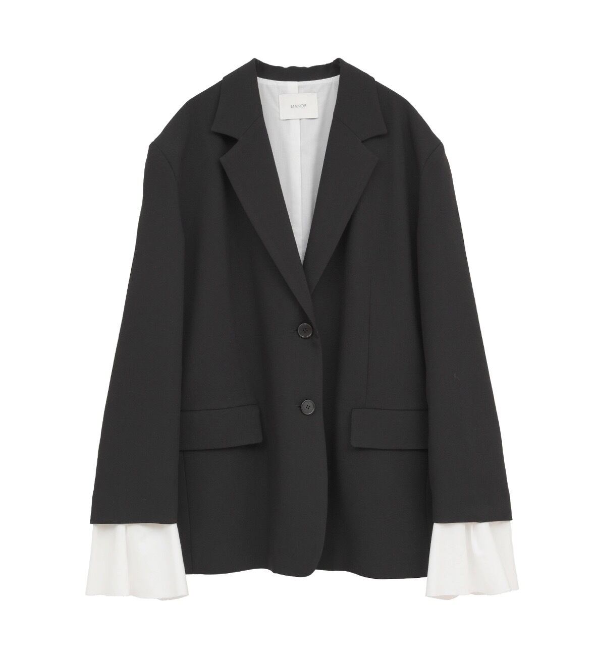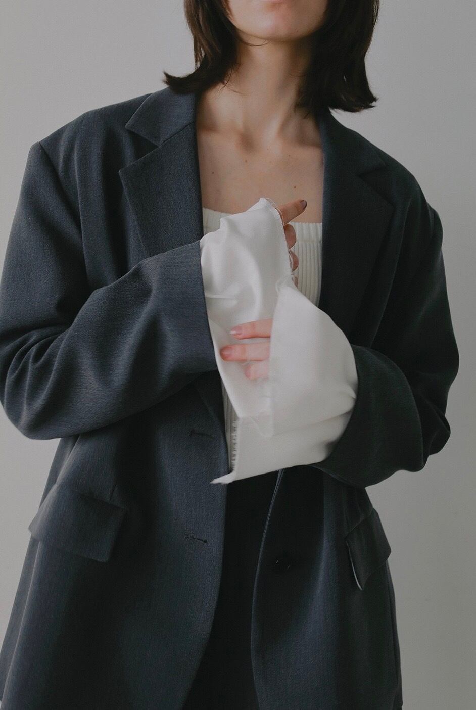 袖口に別布をあしらい、レイヤード風のニュアンスをプラスしたオーバーサイズジャケット。