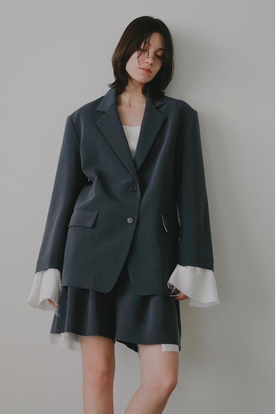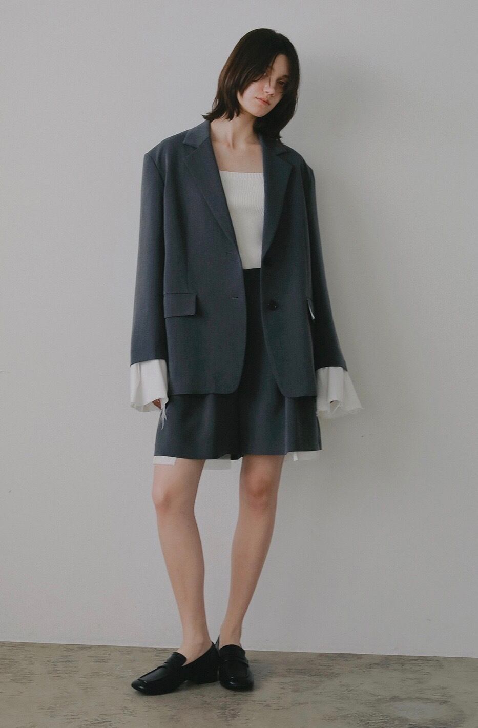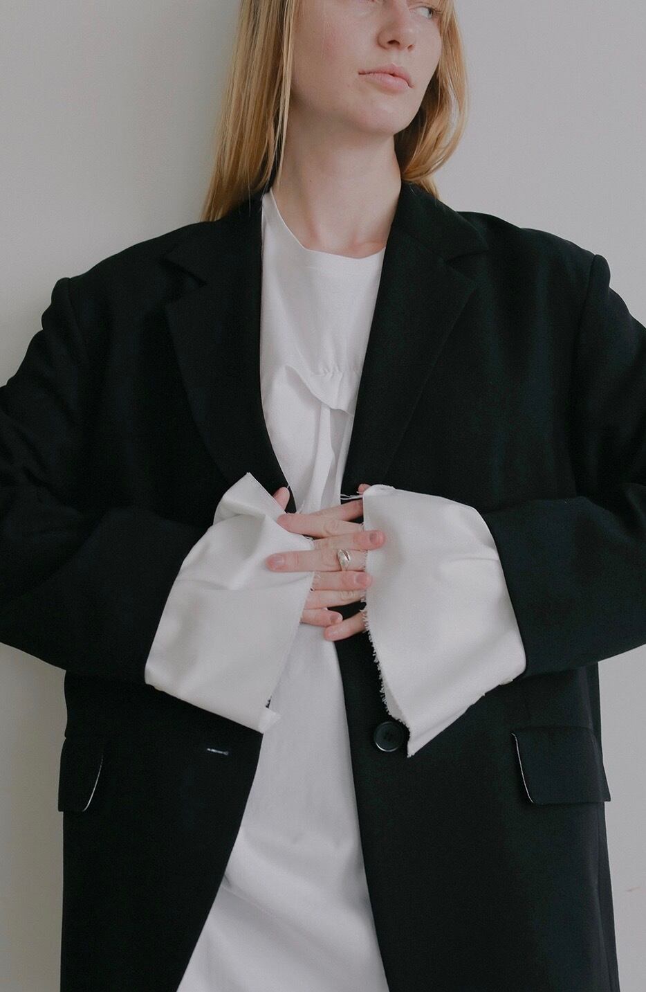 袖口に別布をあしらい、レイヤード風のニュアンスをプラスしたオーバーサイズジャケット。