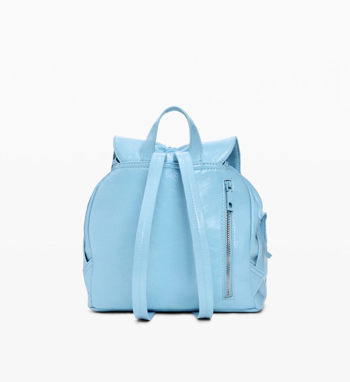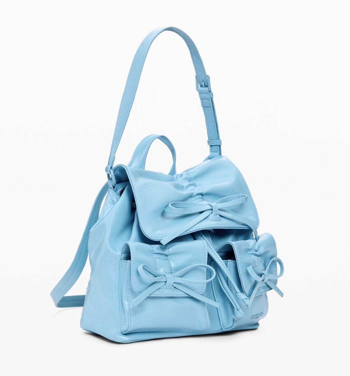 フラップ付きバックパック、フロントポケット、取り外し可能な編み込みハンドル、装飾用リボン、取り外し可能なチャーム、光沢のあるレザー調素材で仕立てられています。