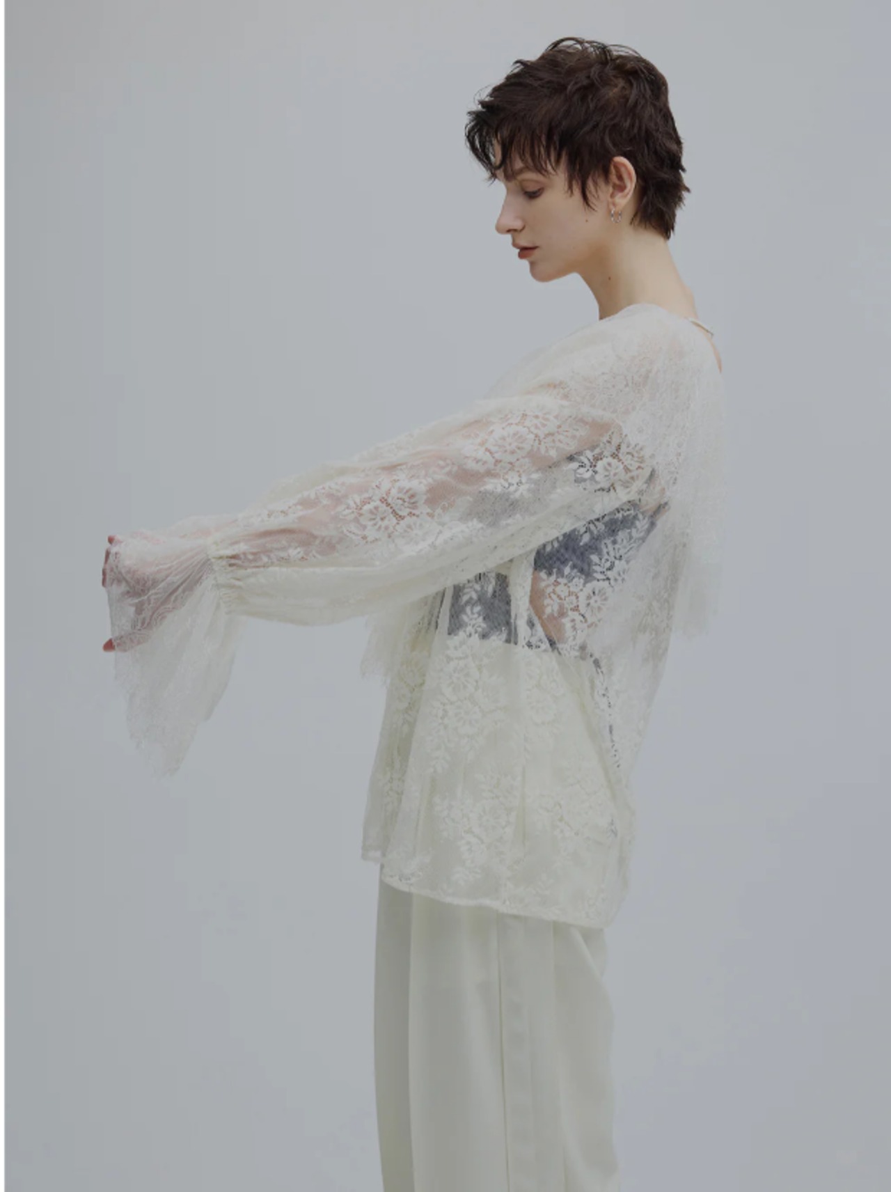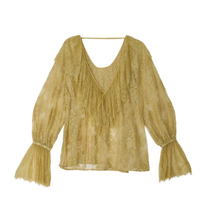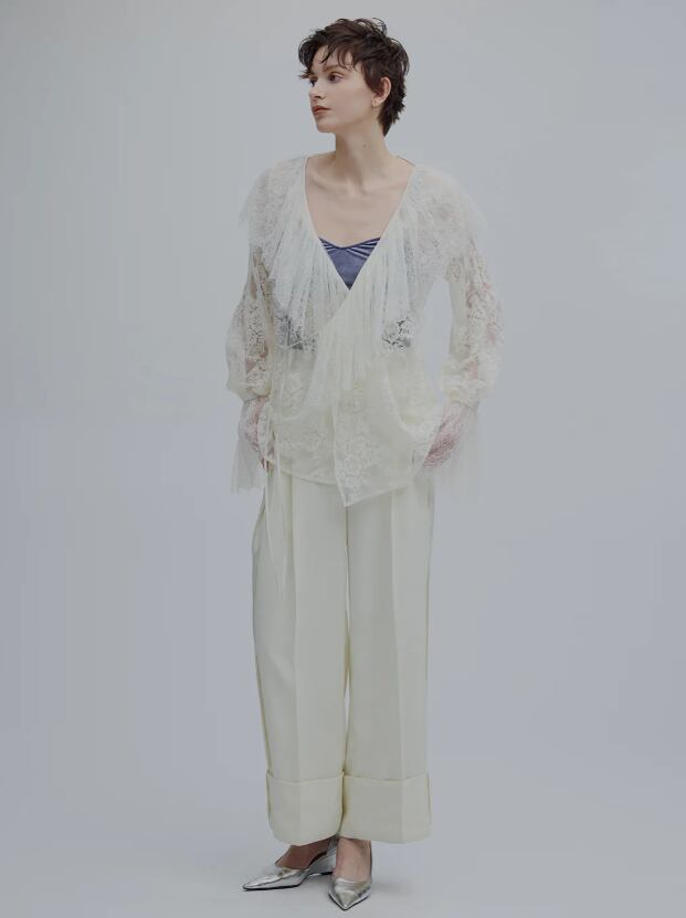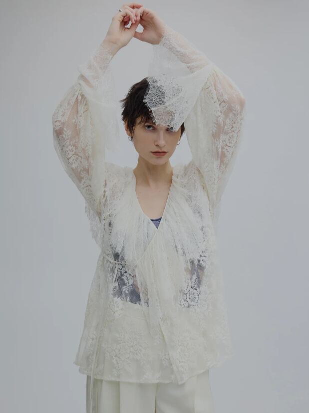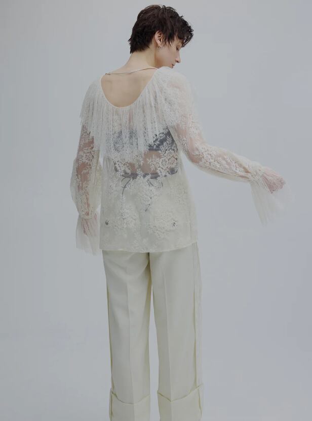 襟元の大ぶりなラッフルデザインがポイントのレースブラウス。