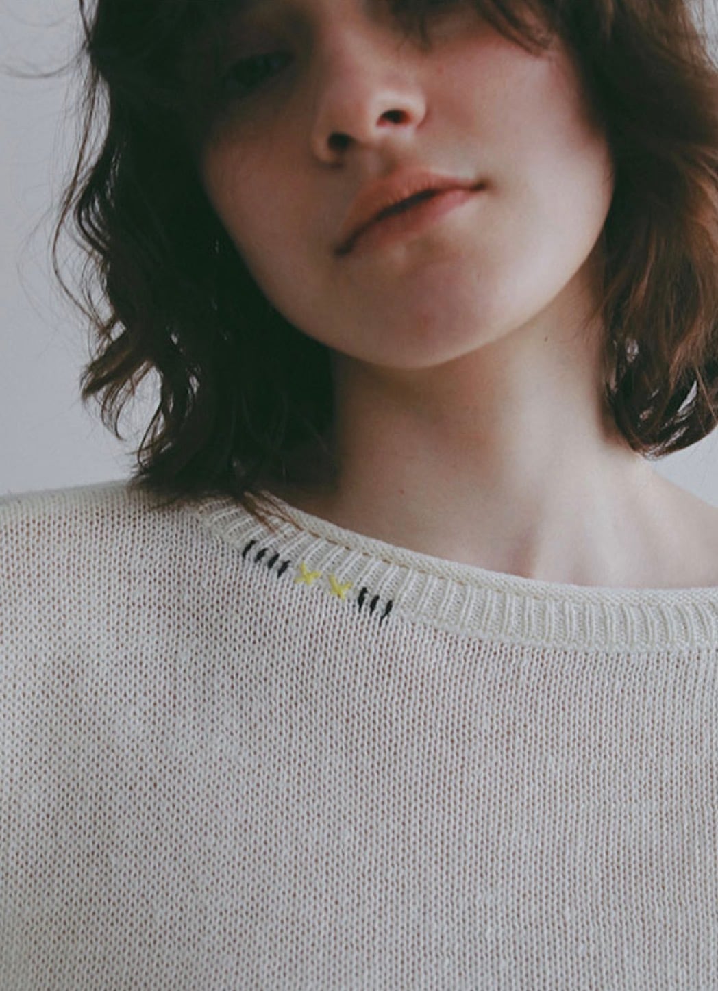 ハンド刺繍で表現されたグラフィックが印象的な、存在感のあるエンブロイダリーローゲージニットプルオーバー。