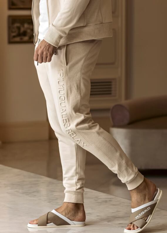 左サイドに大胆に配したエンボスロゴが目を惹くスウェットパンツ。
