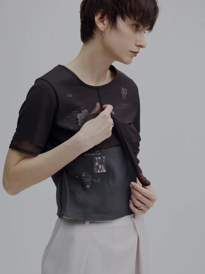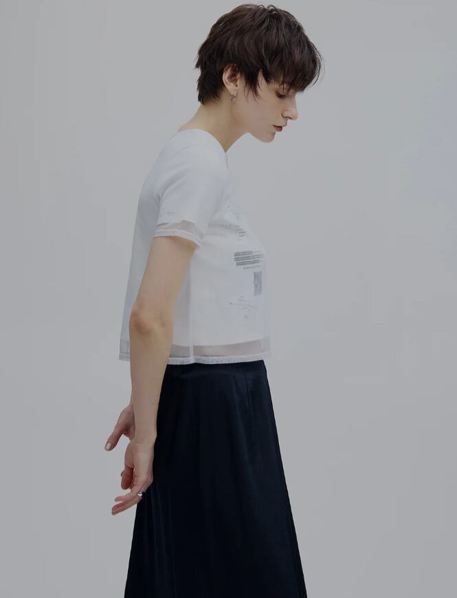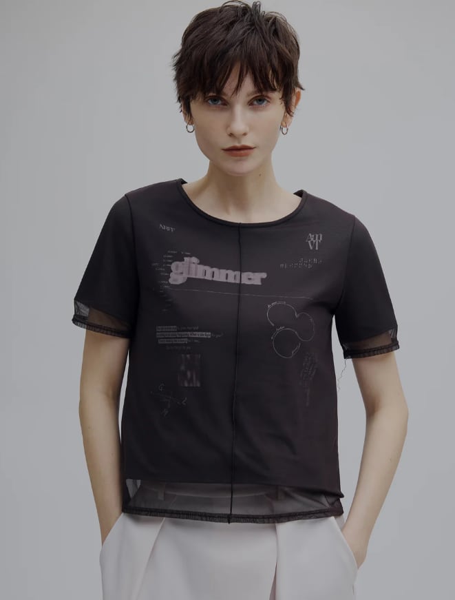 文字やグラフィックがシアー生地によってぼんやりと見えるのがポイントのTシャツ。