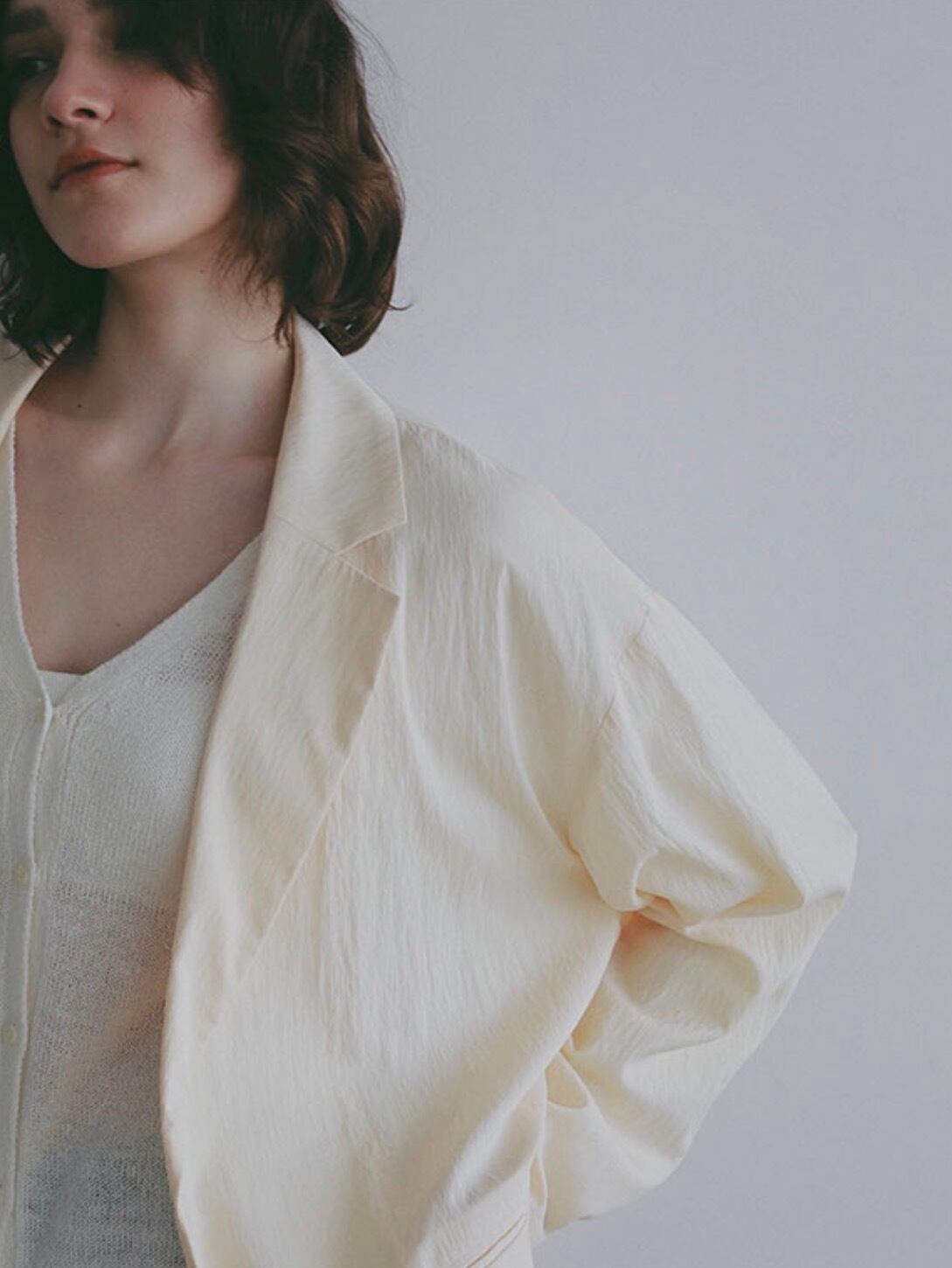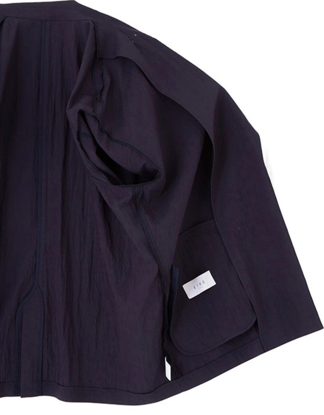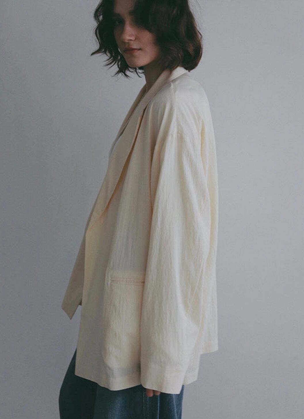 テーラードジャケットのデザインをベースにしながらも、ボタンをあえて省くことで、よりミニマルで軽い印象に。