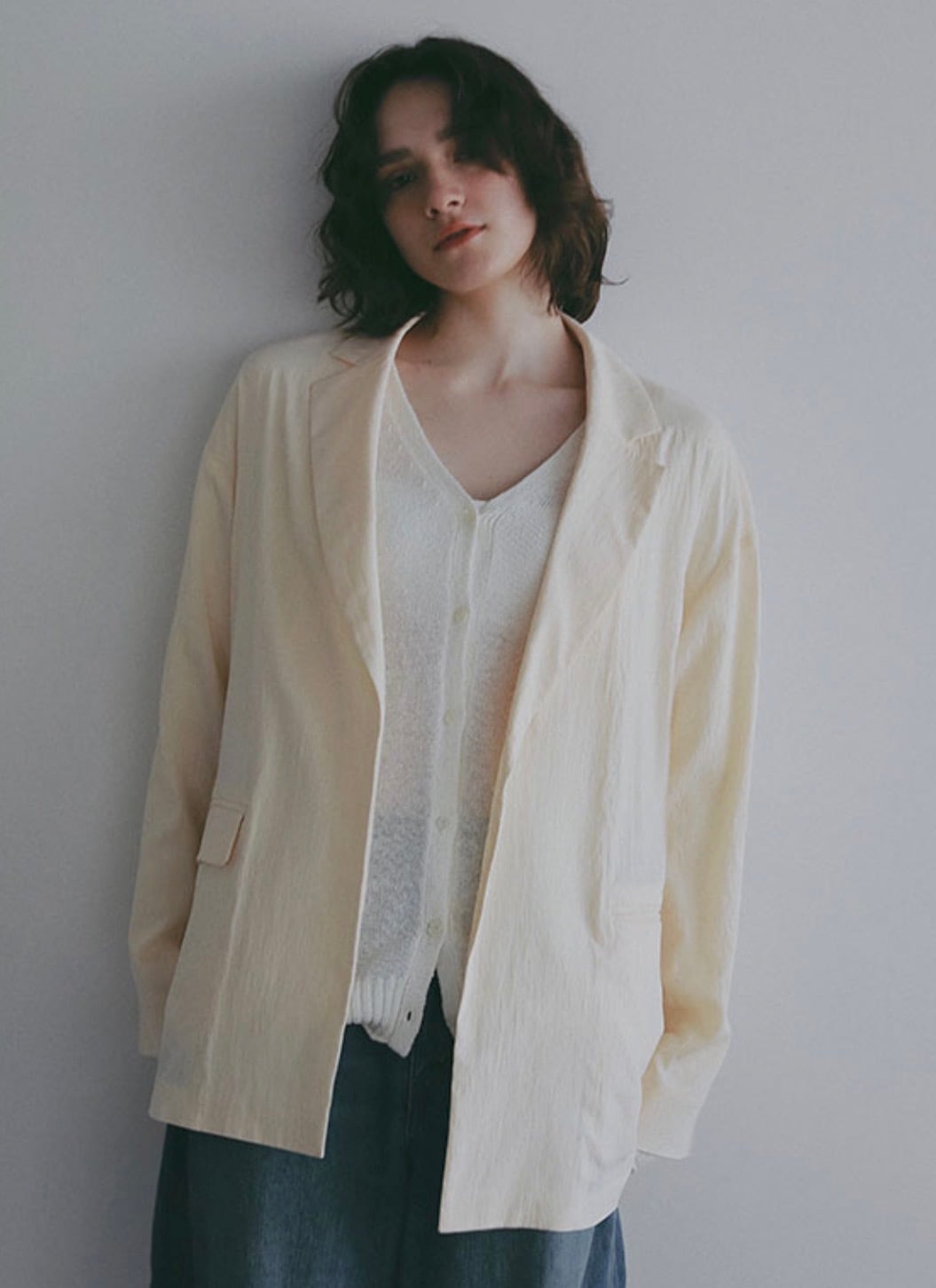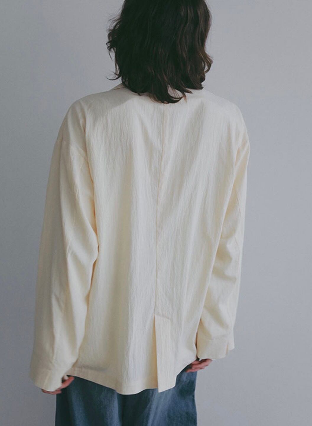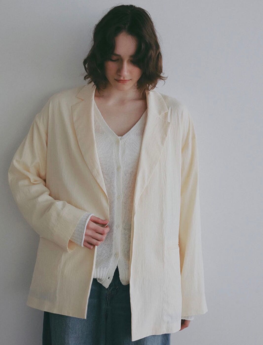 テーラードジャケットのデザインをベースにしながらも、ボタンをあえて省くことで、よりミニマルで軽い印象に。