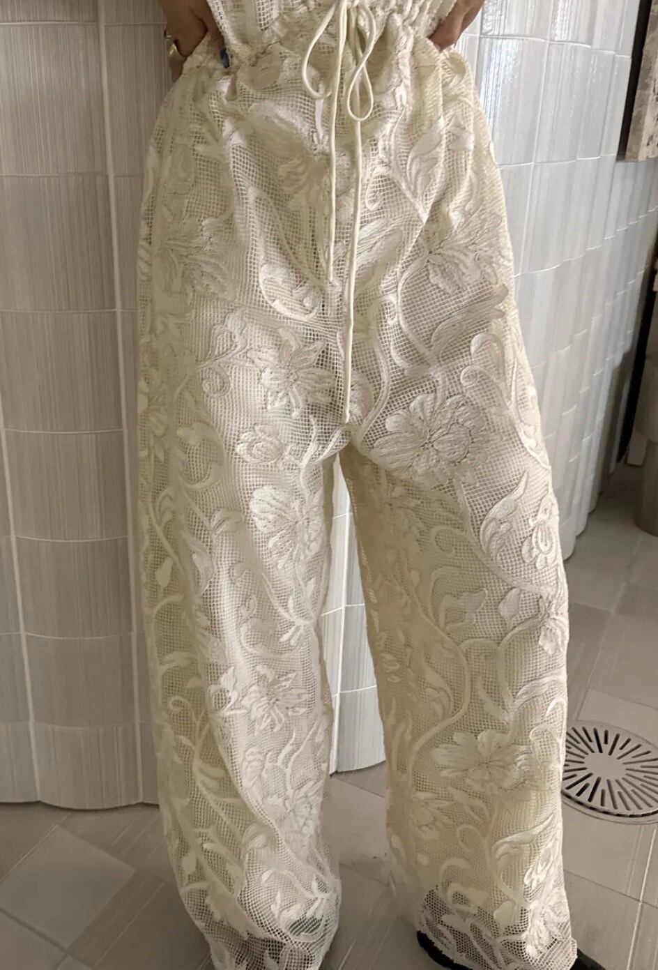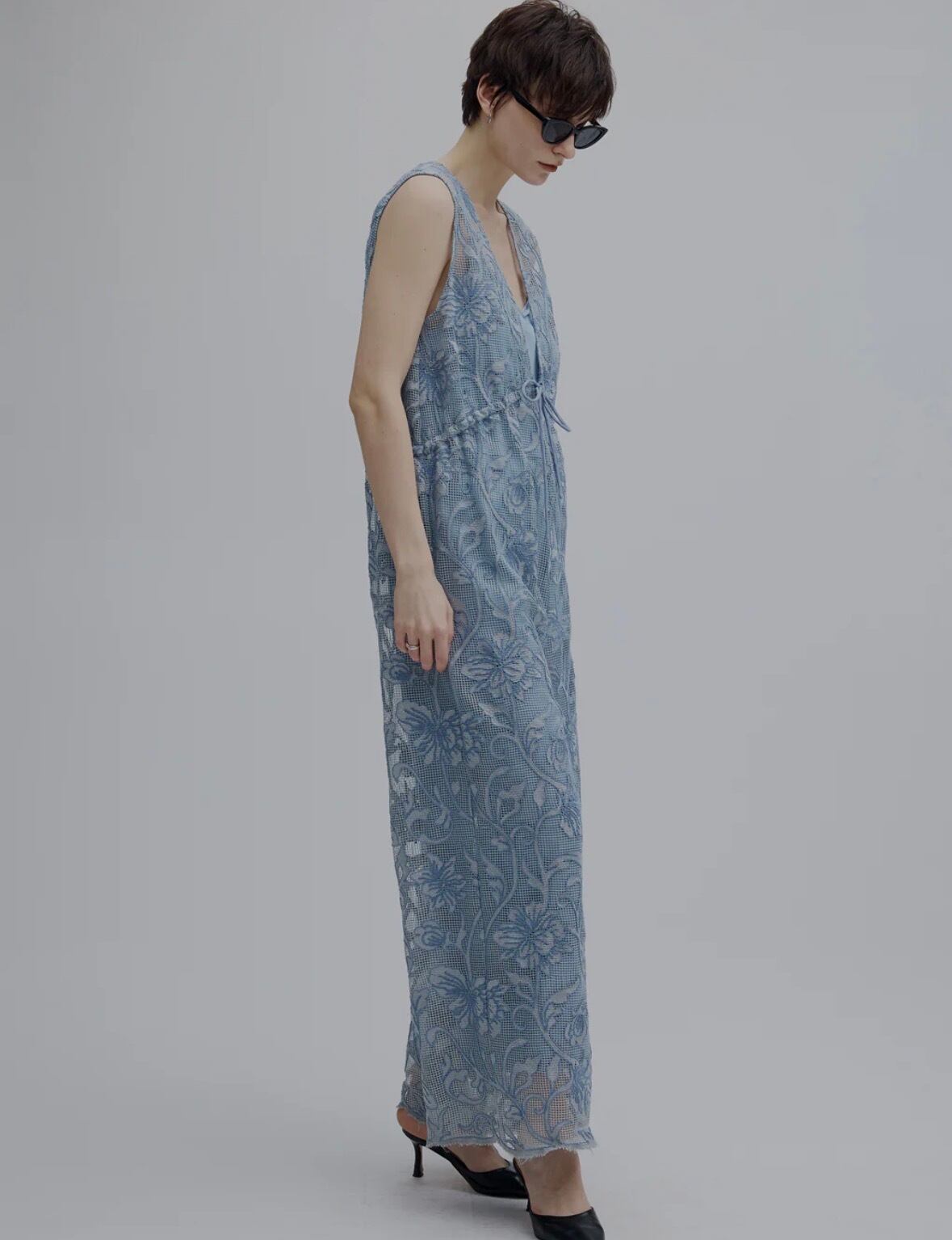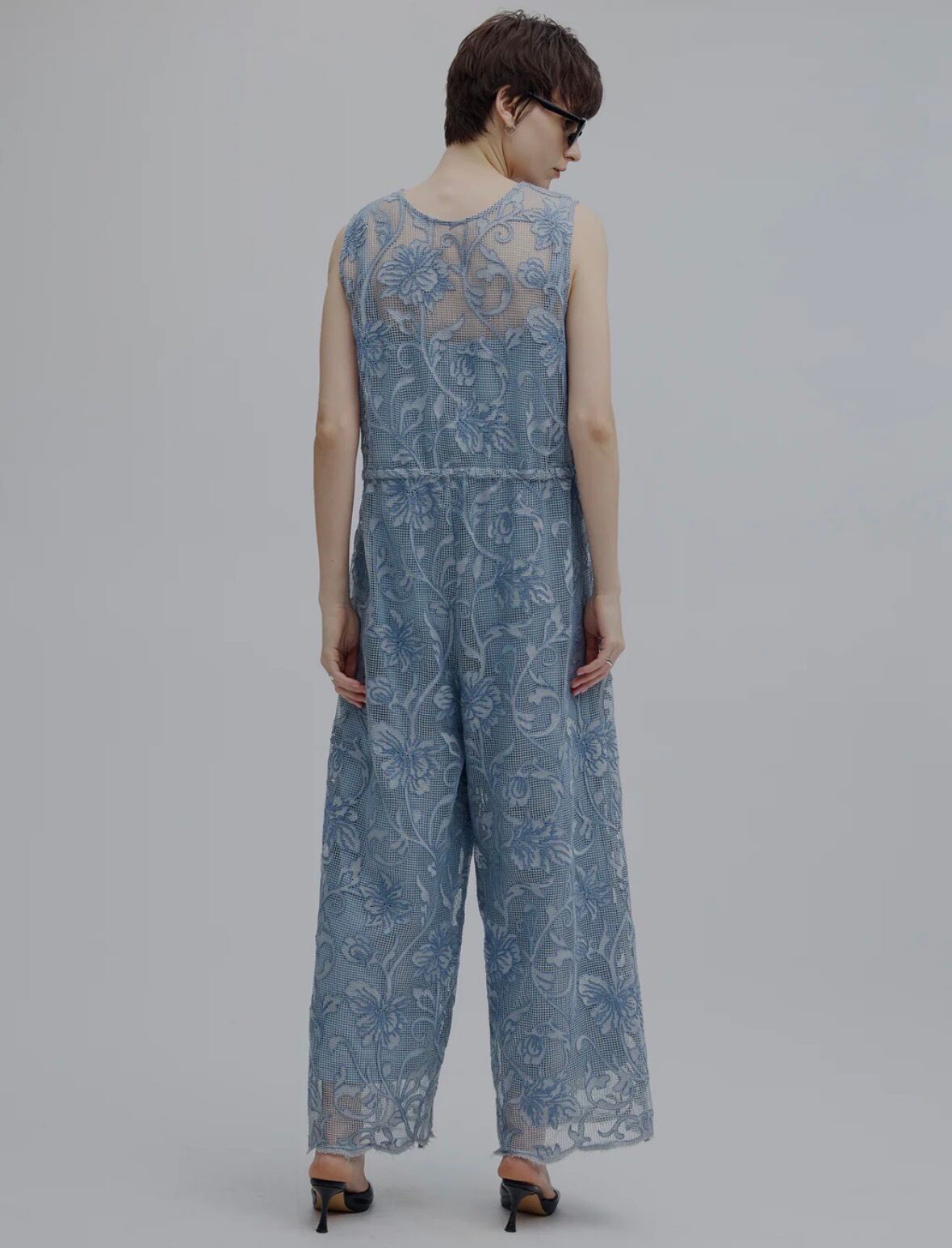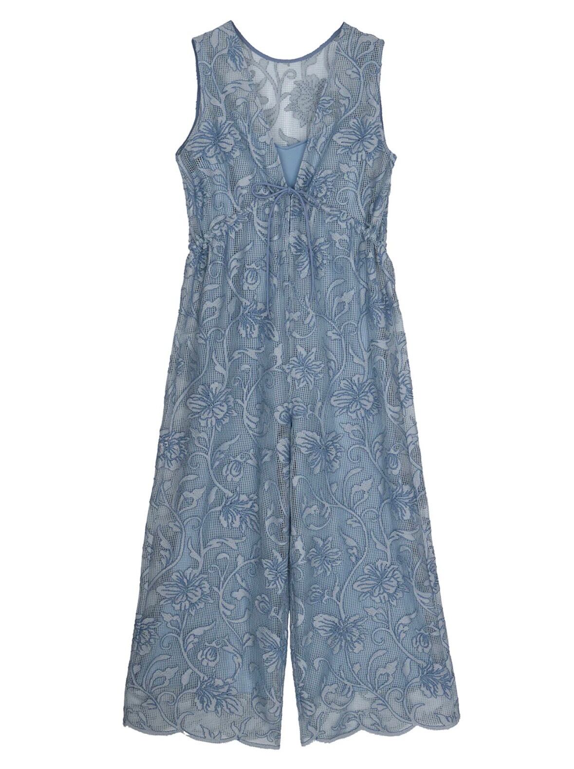 ヨーロッパ調の花柄刺繡を全面に施したメッシュロンパース。