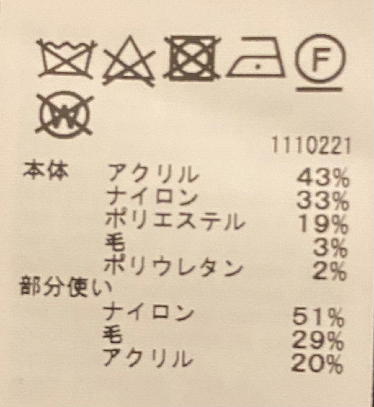 :アクリル43%、ナイロン33%、ポリエステル19%、毛3%、ポリウレタン2%