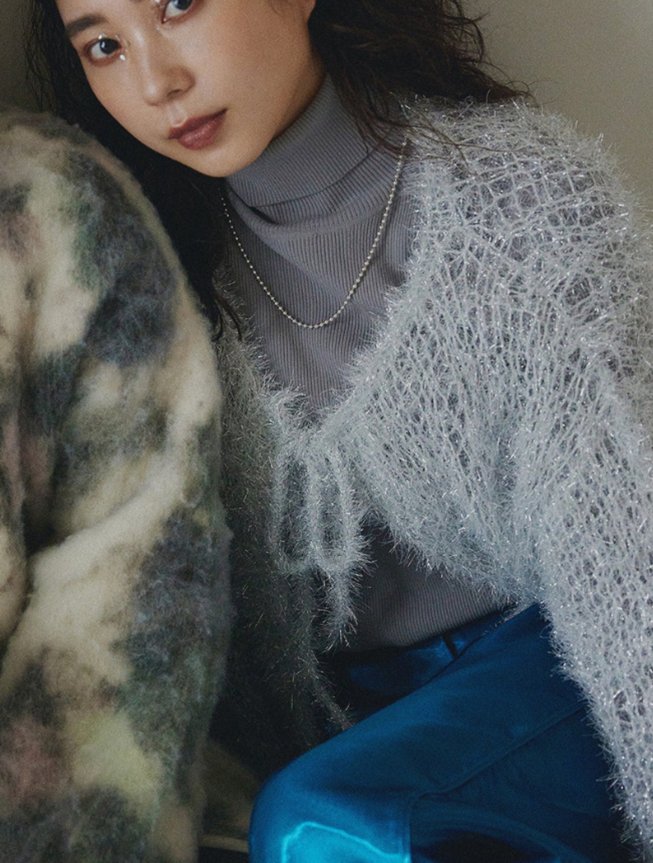 手作業ならではの緩い編地(*1)ときらきらと映えるラメが特徴のアイテム。